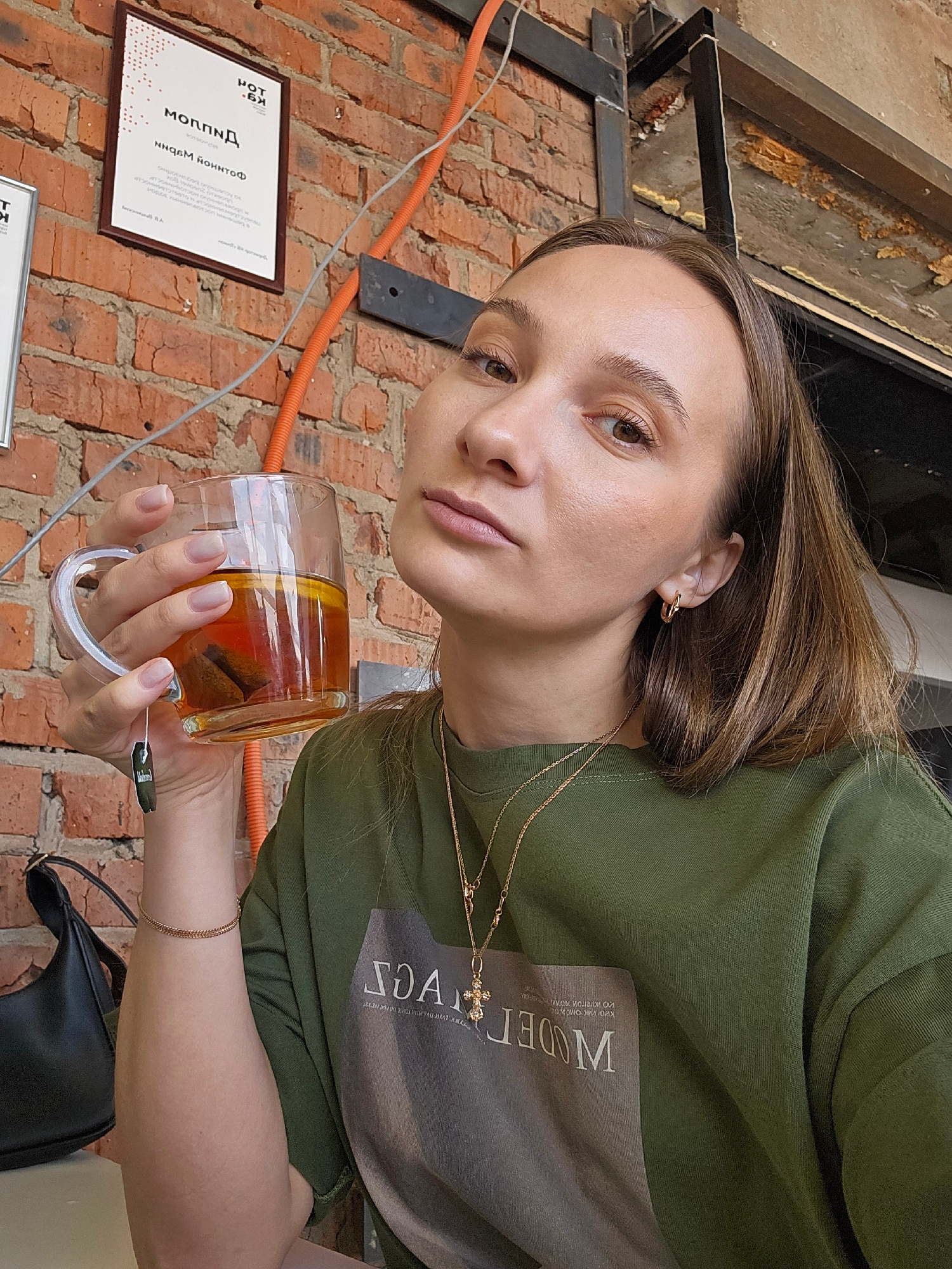 A woman with brown hair and fair skin is holding a clear glass mug filled with a dark liquid, possibly tea, in what appears to be an outdoor setting in Chaikovsky, Russia. She is wearing a green top w…read more