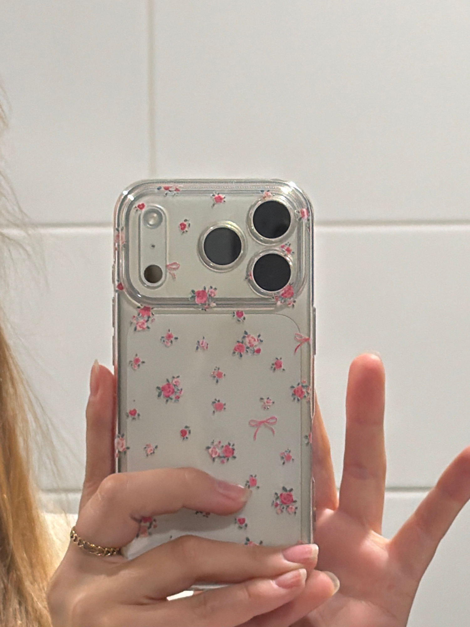 A person is holding a smartphone in their hands. The phone has a transparent case with a floral pattern. The case has a clear border and features pink roses and a pink ribbon design on a light backgro…read more