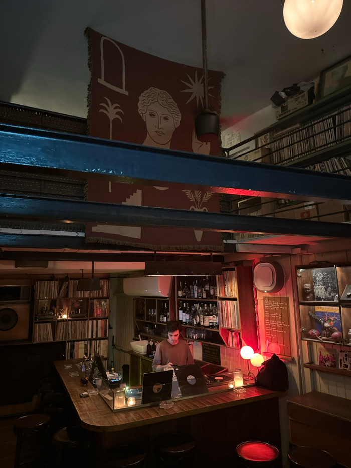 This image captures the interior of Alfa Omega, a record bar situated in Tel-Aviv, Israel. The establishment is dimly lit with warm, amber, and red light sources. The central feature is a curved, dar…read more