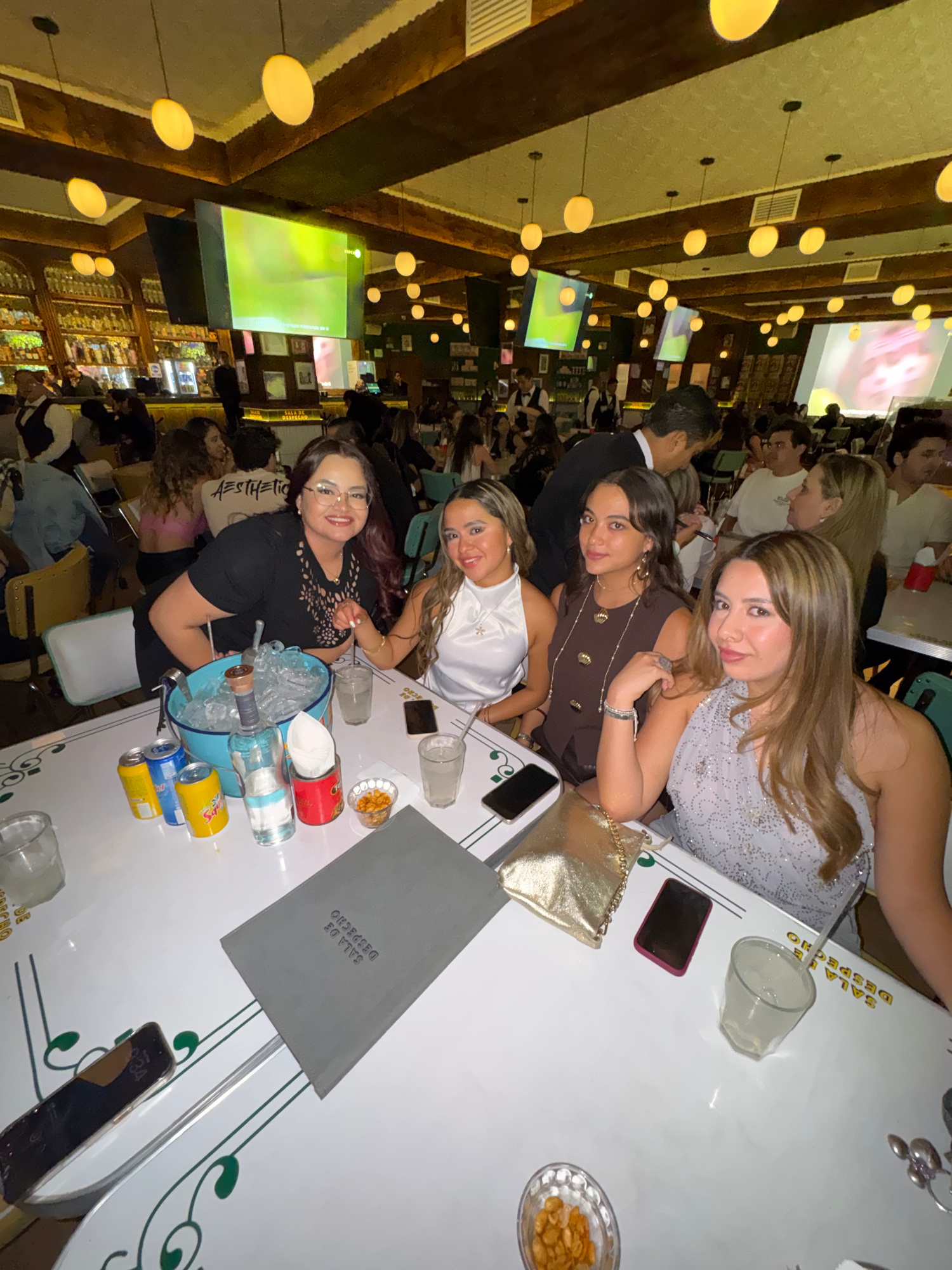 The image depicts an interior scene within a lively bar or restaurant identified as Sala de Despacho in Puebla, Mexico. In the foreground, four adult women are seated at a white table with green deco…read more