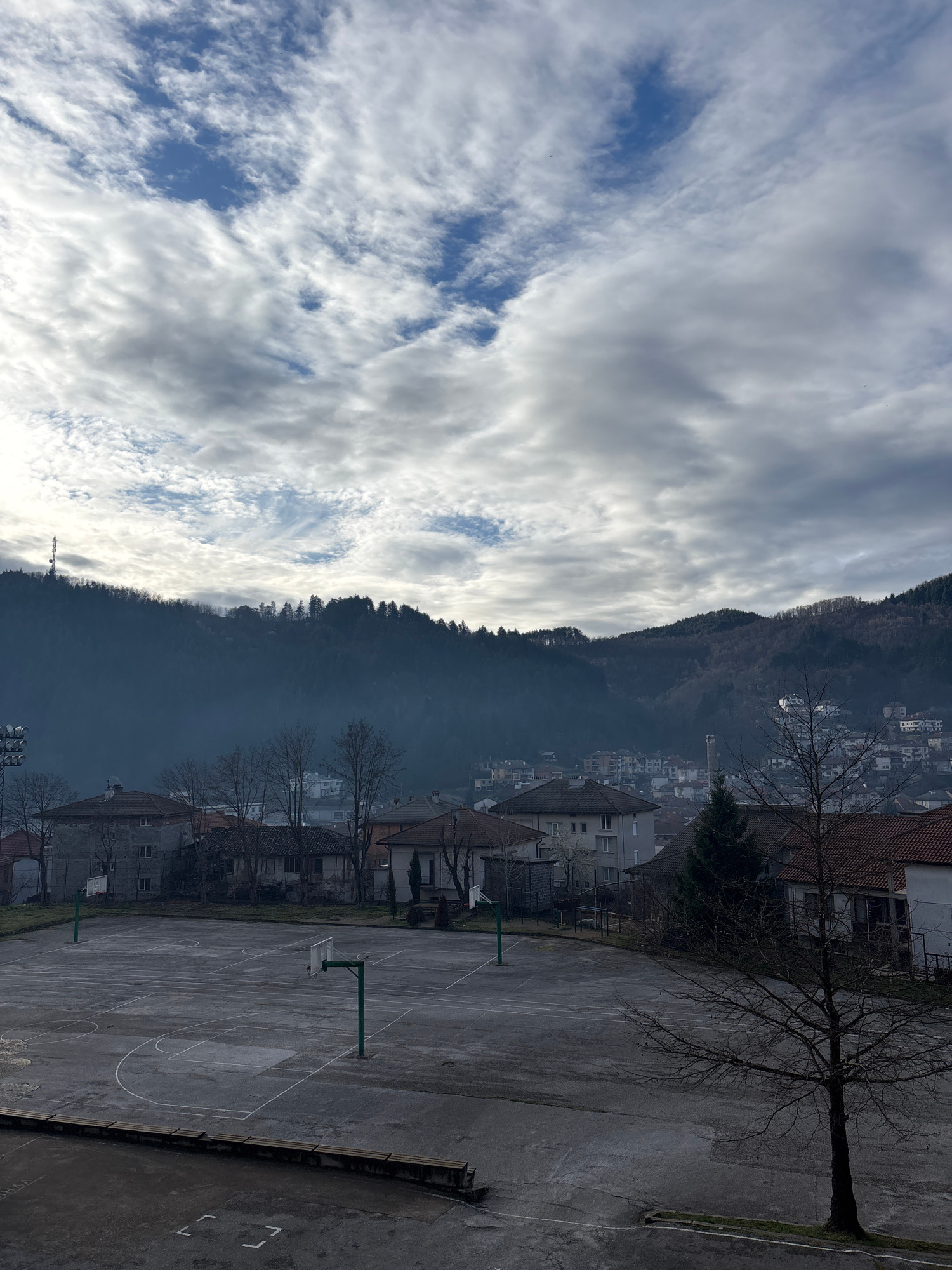 The image depicts an outdoor basketball court in Zlatograd, Bulgaria, framed by a mountain on the left and buildings on the right. The court is gray concrete with white lines marking the boundaries an…read more