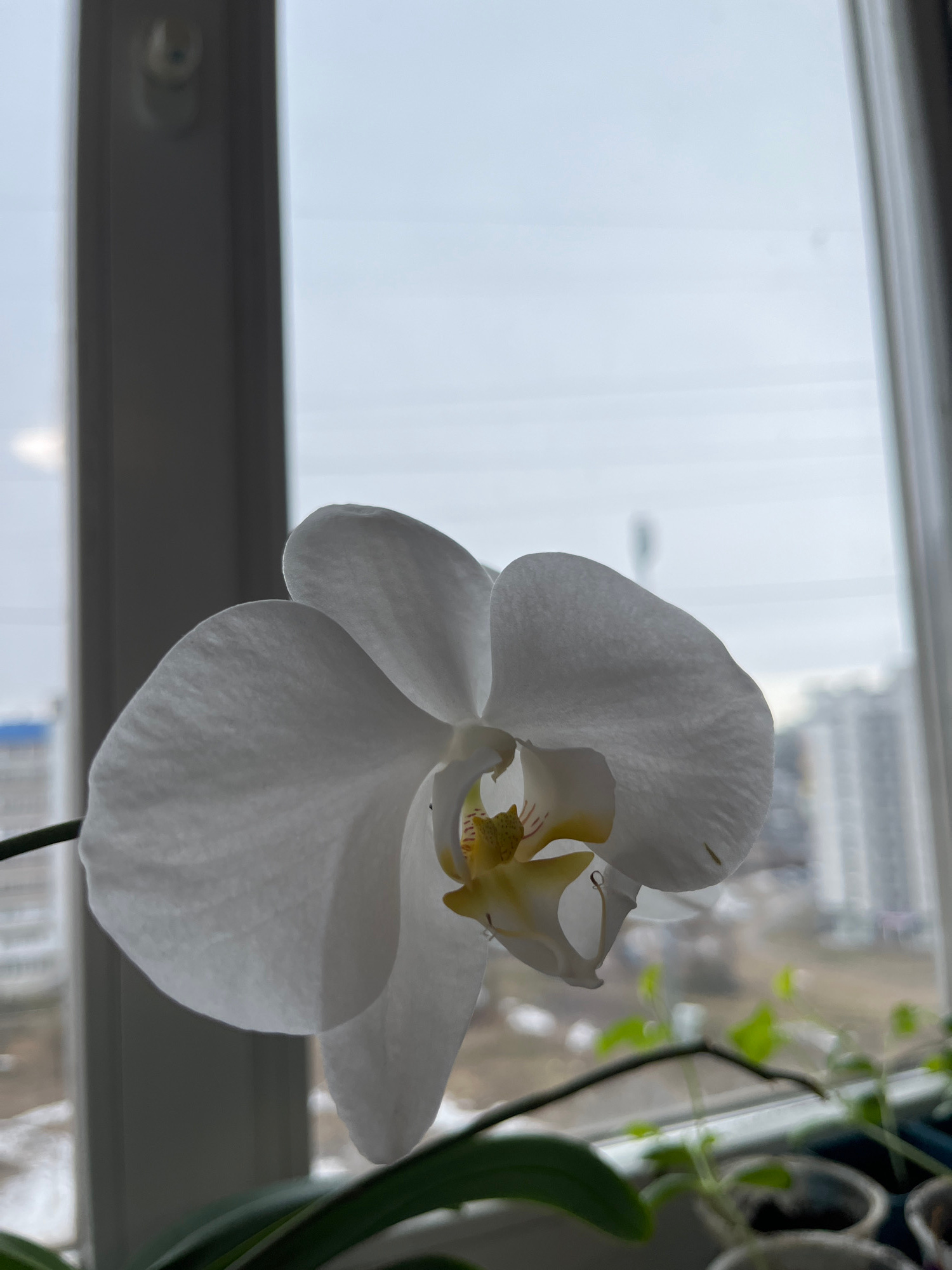 A white orchid flower is in focus, set against a blurred background of a city seen through a window. The orchid is positioned to the right of the frame, partially obscuring a view of buildings and an…read more