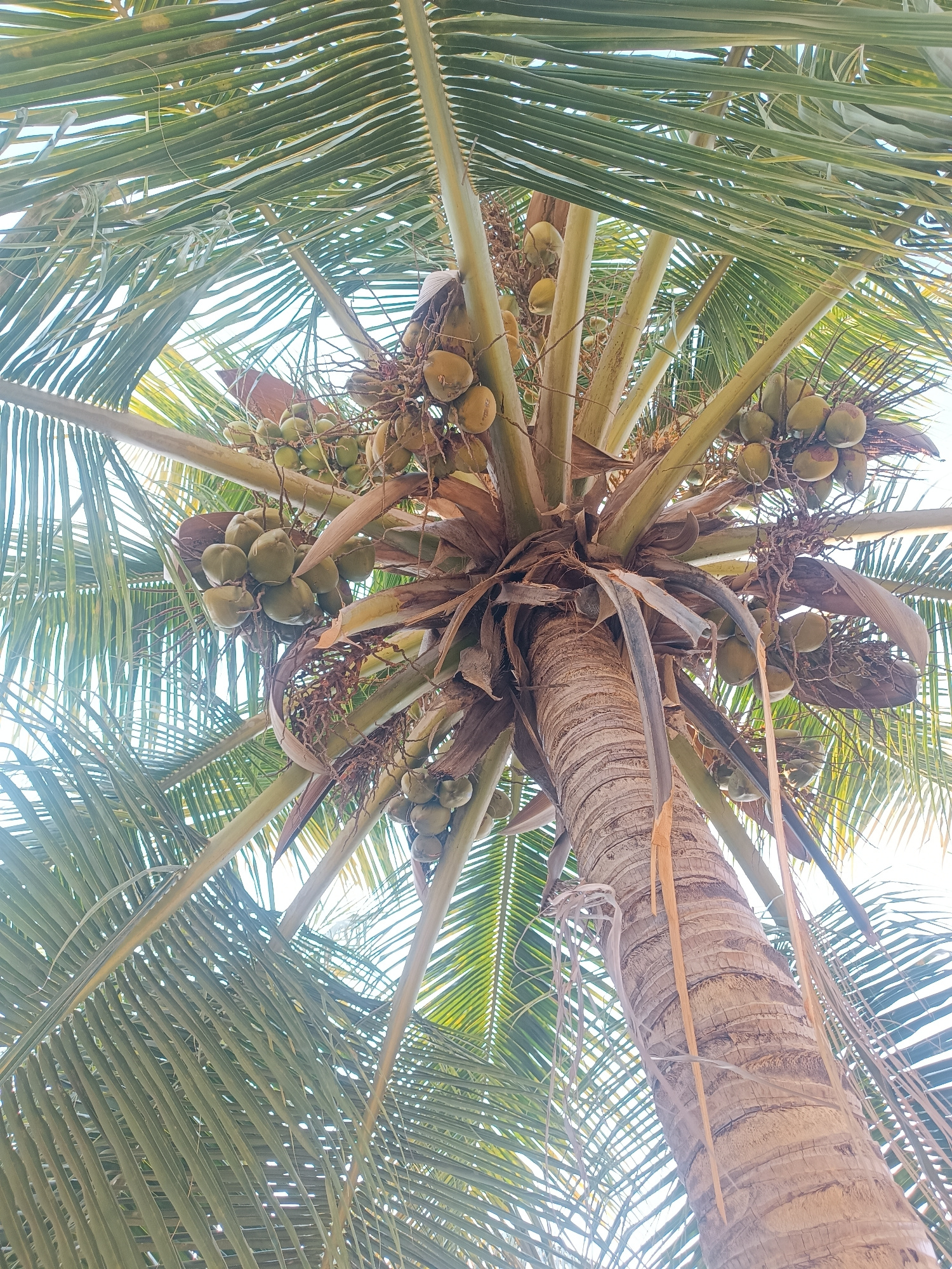 Looking up from the base of a coconut palm in Pedda Kammavaripalli, India, the image captures the textured trunk, radiating fronds, and heavy clusters of green coconuts. The tree's central stalk rises…read more