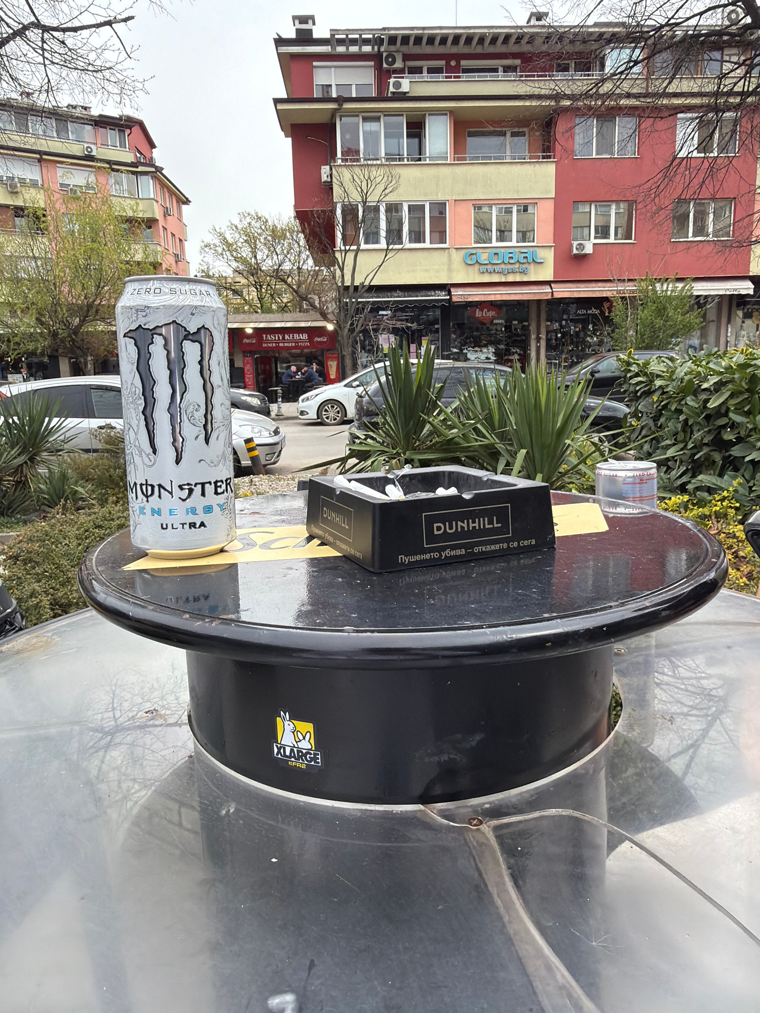 The image depicts an outdoor scene in Sofia, Bulgaria. In the foreground, a black, round-topped trash receptacle is the primary focus, covered in a large plastic cover. A can of Monster Energy Ultra,…read more