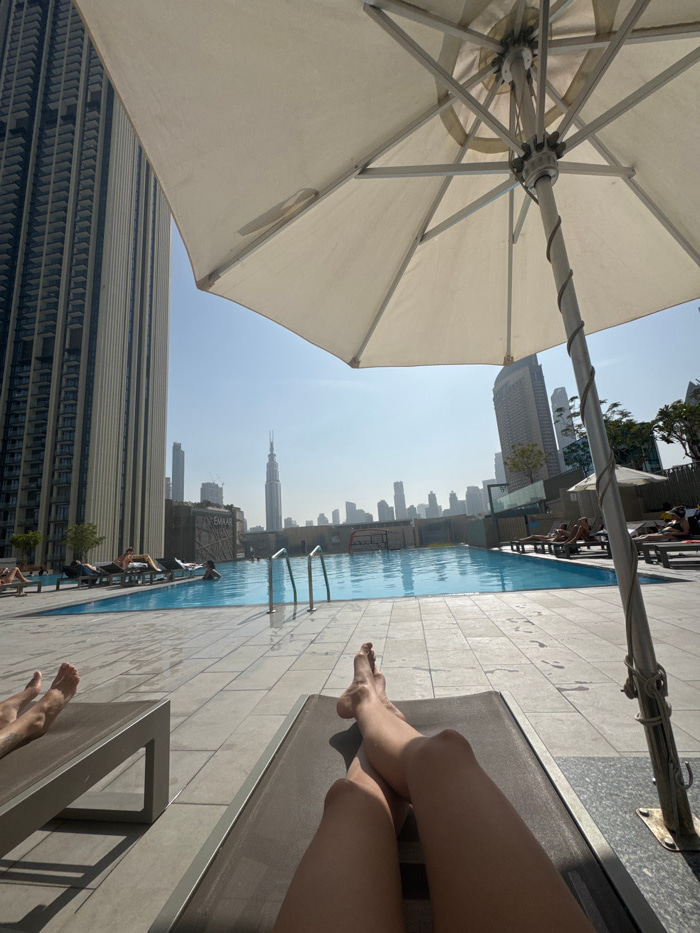 The image depicts a first-person view from a sun lounger on an outdoor pool deck in Downtown Dubai, United Arab Emirates, under a clear, bright sky. In the immediate foreground, the lower legs and fee…read more