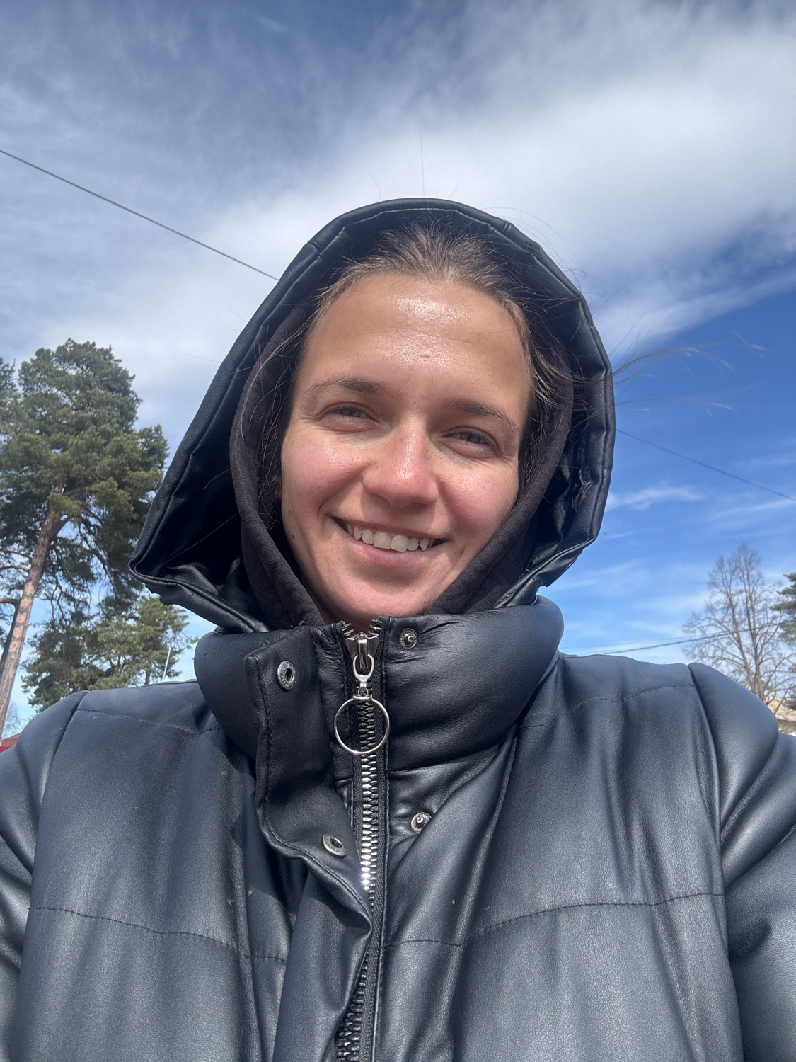 A bright outdoor selfie captures a young adult smiling broadly at the camera. The individual wears a black hooded sweatshirt, with the hood pulled up, and a shiny black puffer jacket. The jacket featu…read more