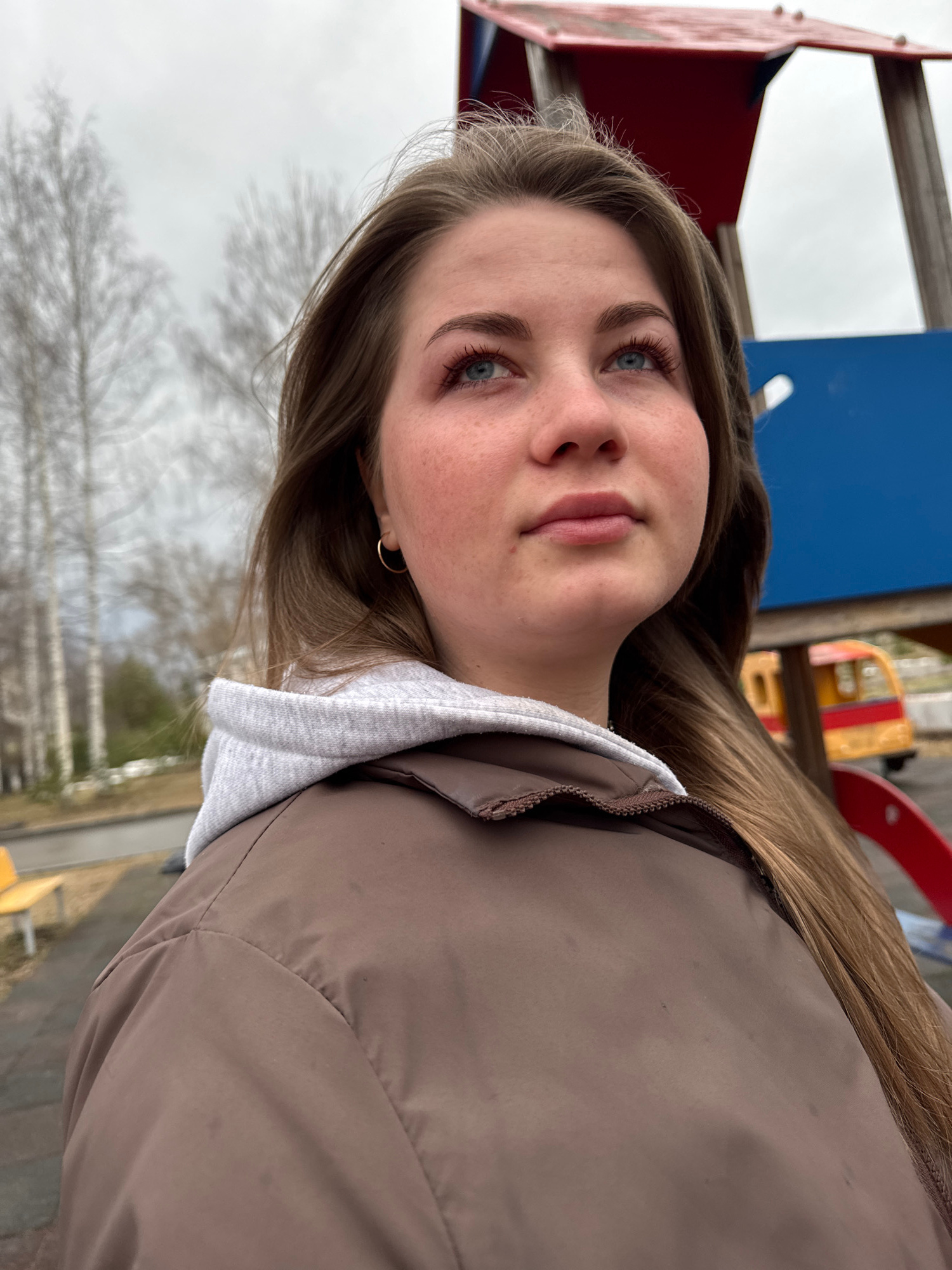 A close-up, medium-shot photograph shows a young woman with light brown hair and blue eyes looking at the camera. Her fair skin is slightly flushed. She wears a brown jacket with a gray hoodie underne…read more