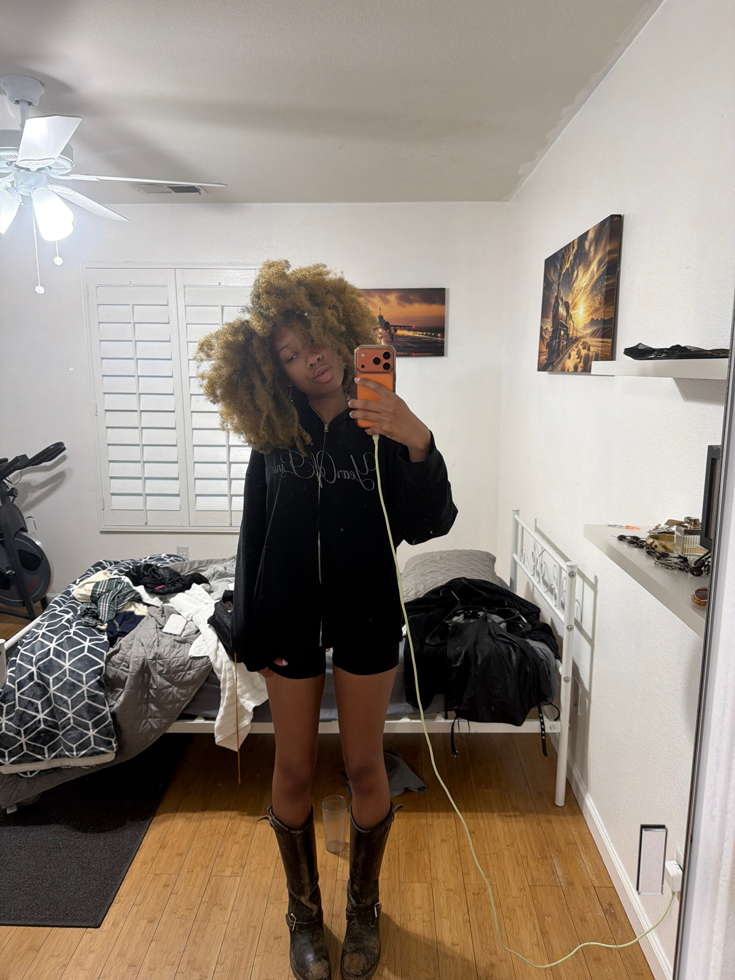 A person with curly hair wearing a black jacket and black shorts is taking a selfie in a mirror. They are standing in a room with white walls, a white ceiling fan, and a wooden floor. There are two pa…read more