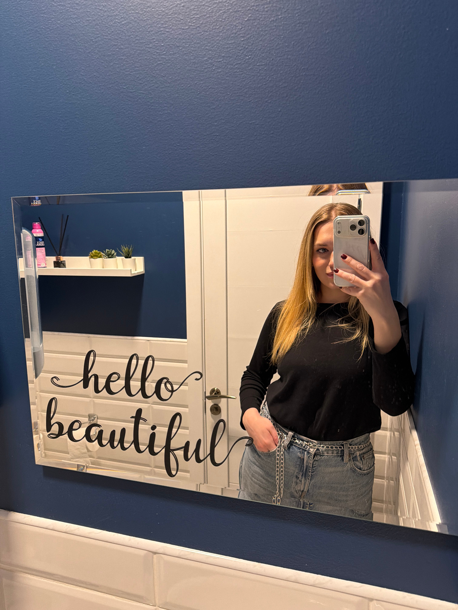 A young woman is taking a mirror selfie in a bathroom. The wall is a dark blue, and the vanity has white tile. The mirror has "hello beautiful" written on it in black script. She is holding a white iP…read more
