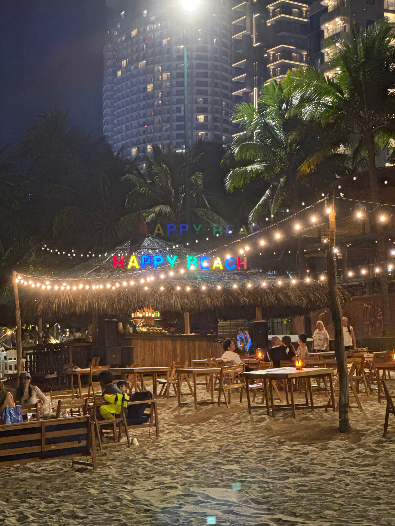 The scene is an outdoor restaurant at night, situated on a beach in an unknown city. The restaurant is adorned with string lights. The words "HAPPY BEACH" are displayed in colorful, illuminated letter…read more