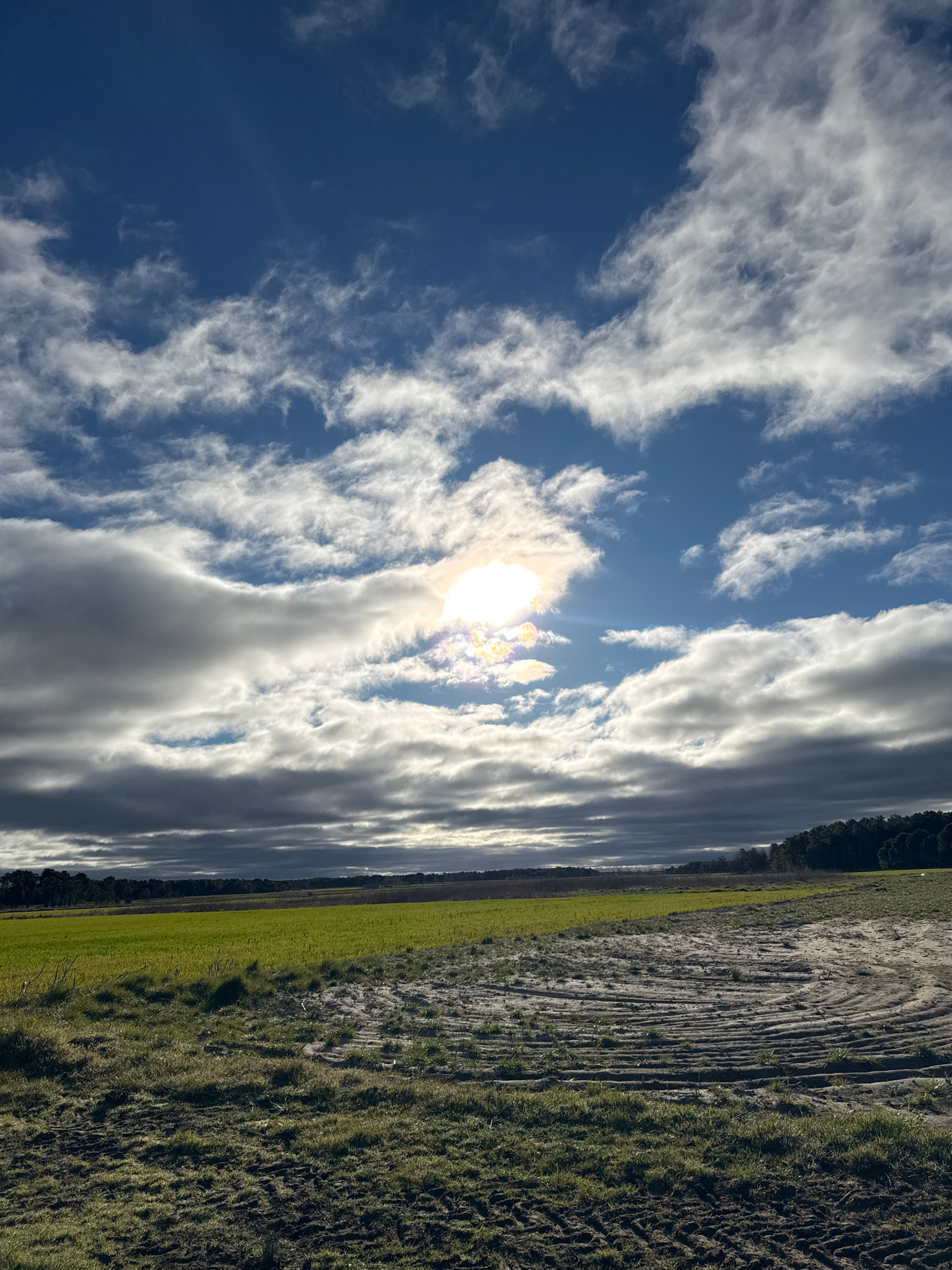 The image depicts a rural landscape under a bright, partly cloudy sky. The sun is visible through a break in the clouds, creating a glare. The ground is divided into three sections: a strip of short g…read more