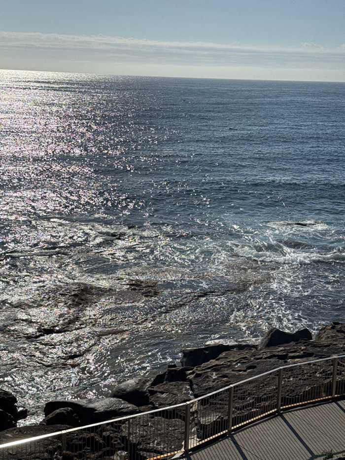 The image displays an ocean view, sparkling under sunlight, extending to a distant horizon. To the right, dark, rocky terrain meets the water, interspersed with a metal railing and boardwalk structure…read more