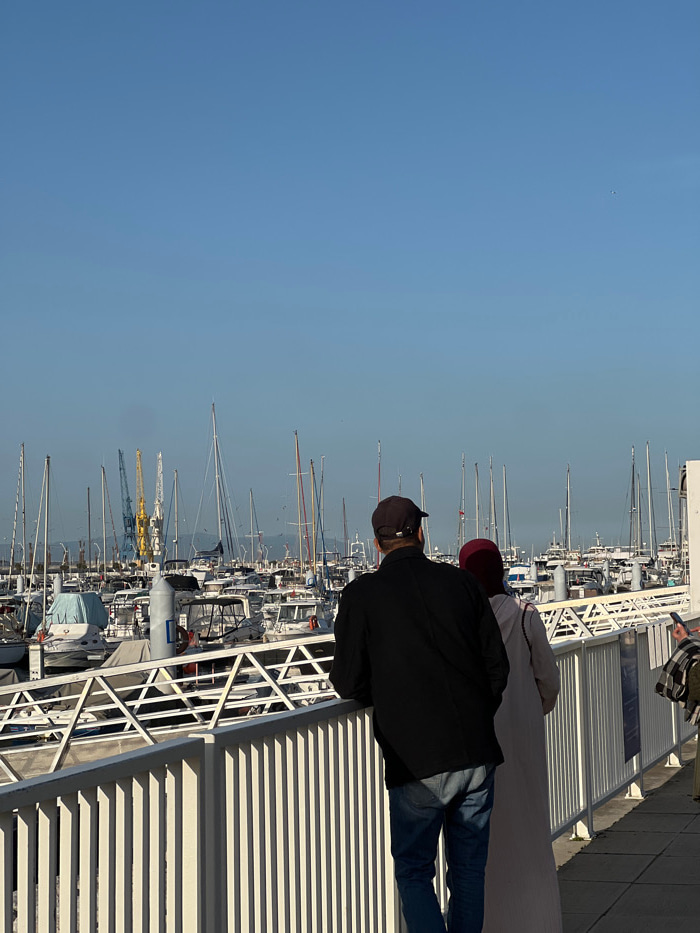 The image depicts a marina in Tangier, Morocco, viewed on a clear, bright day under a blue sky. In the immediate foreground, a white metal railing with vertical balusters separates the viewer from theβ¦read more