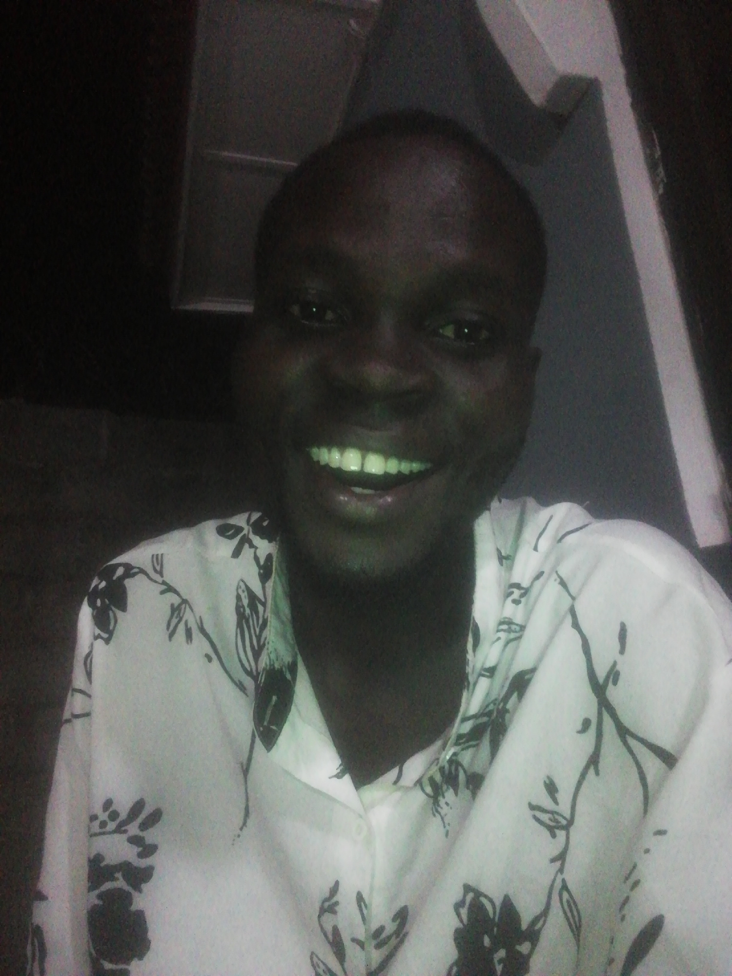 A person with dark skin is smiling at the camera. They are wearing a light-colored button-down shirt with a dark floral pattern. The background is dark, but a corner of a white-painted wall is visibleβ¦read more