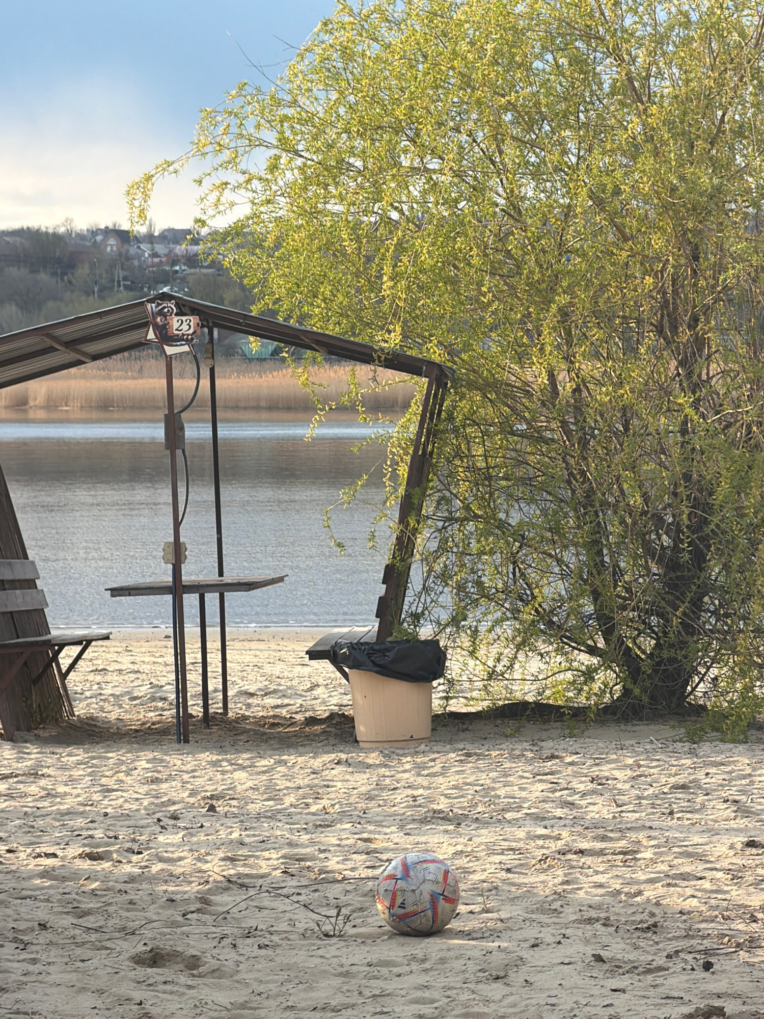 The image shows a sandy beach in Olginskaya, Russia, next to a body of water (likely the Don River, given the location). A metal structure with a sign labeled "23" stands near the edge of the beach. B…read more