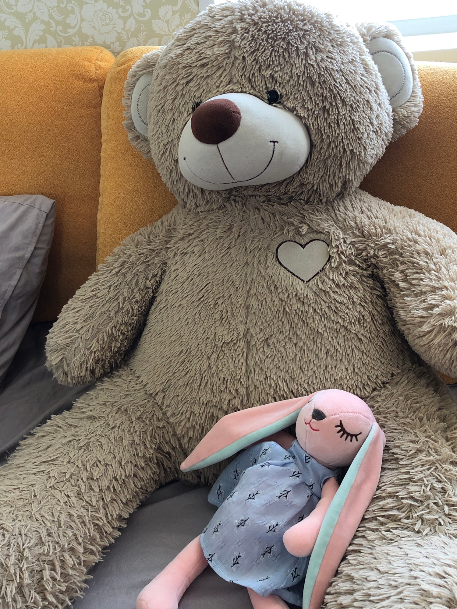 A close-up shot displays a large, stuffed, light brown teddy bear with a white heart patch on its chest, resting on a mustard-colored cushion and grey bed linen. A plush pink rabbit toy wearing a blue…read more