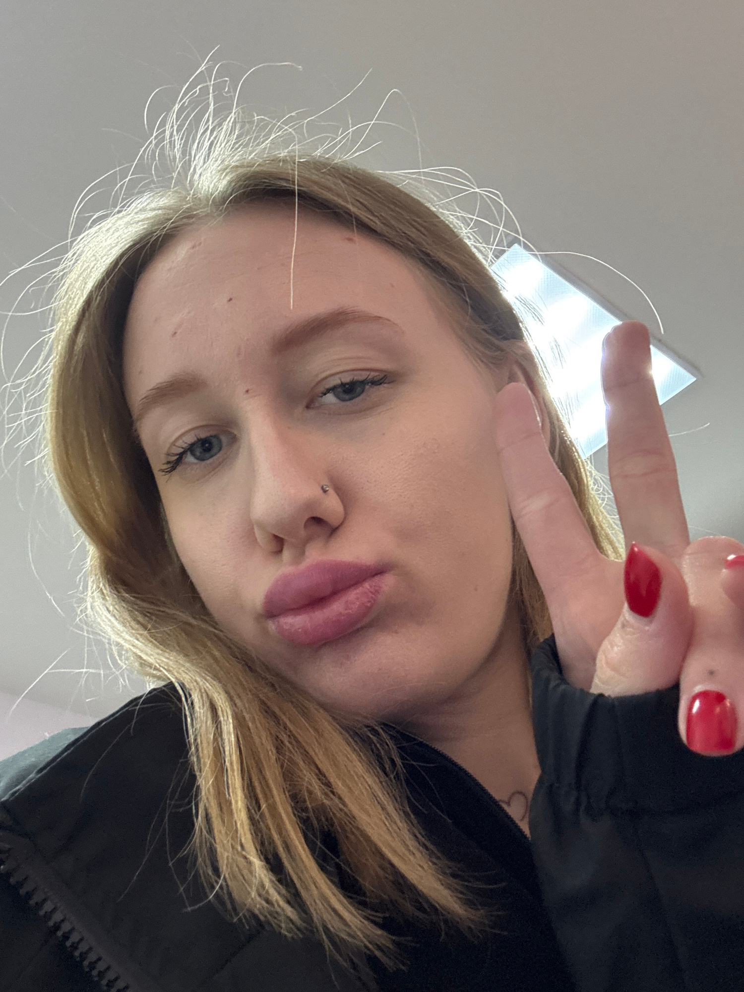 A young woman with light skin and blonde hair is posing for a selfie. She has blue eyes and a nose piercing. Her lips are pursed in a pout. She is holding up two fingers in a peace sign, and her fingeβ¦read more