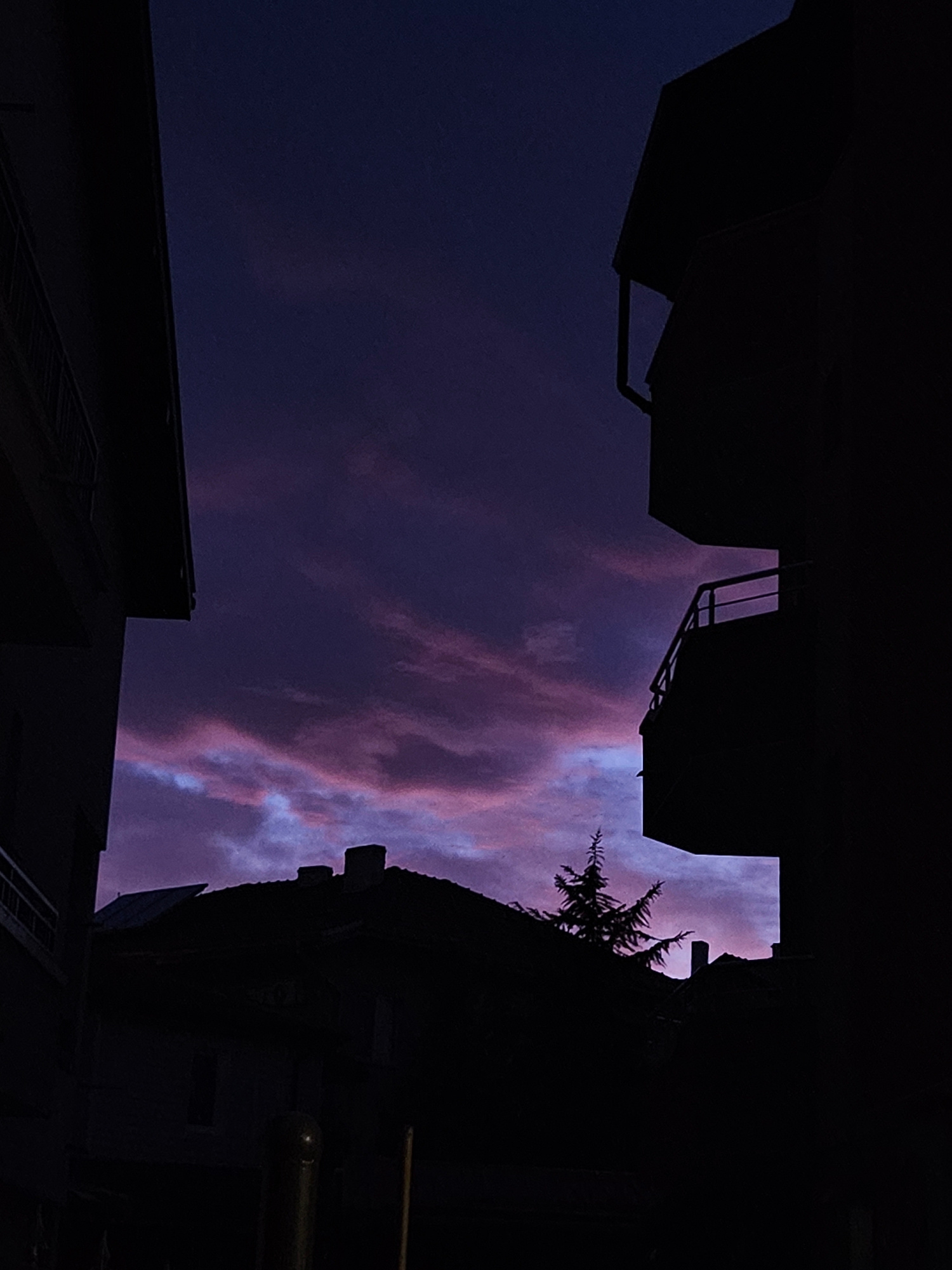 The image depicts a view of the sky at dusk, taken from a low angle, likely within a narrow urban space in Chernomorets, Bulgaria. Buildings surround the visible sky, silhouetted against the deep purp…read more