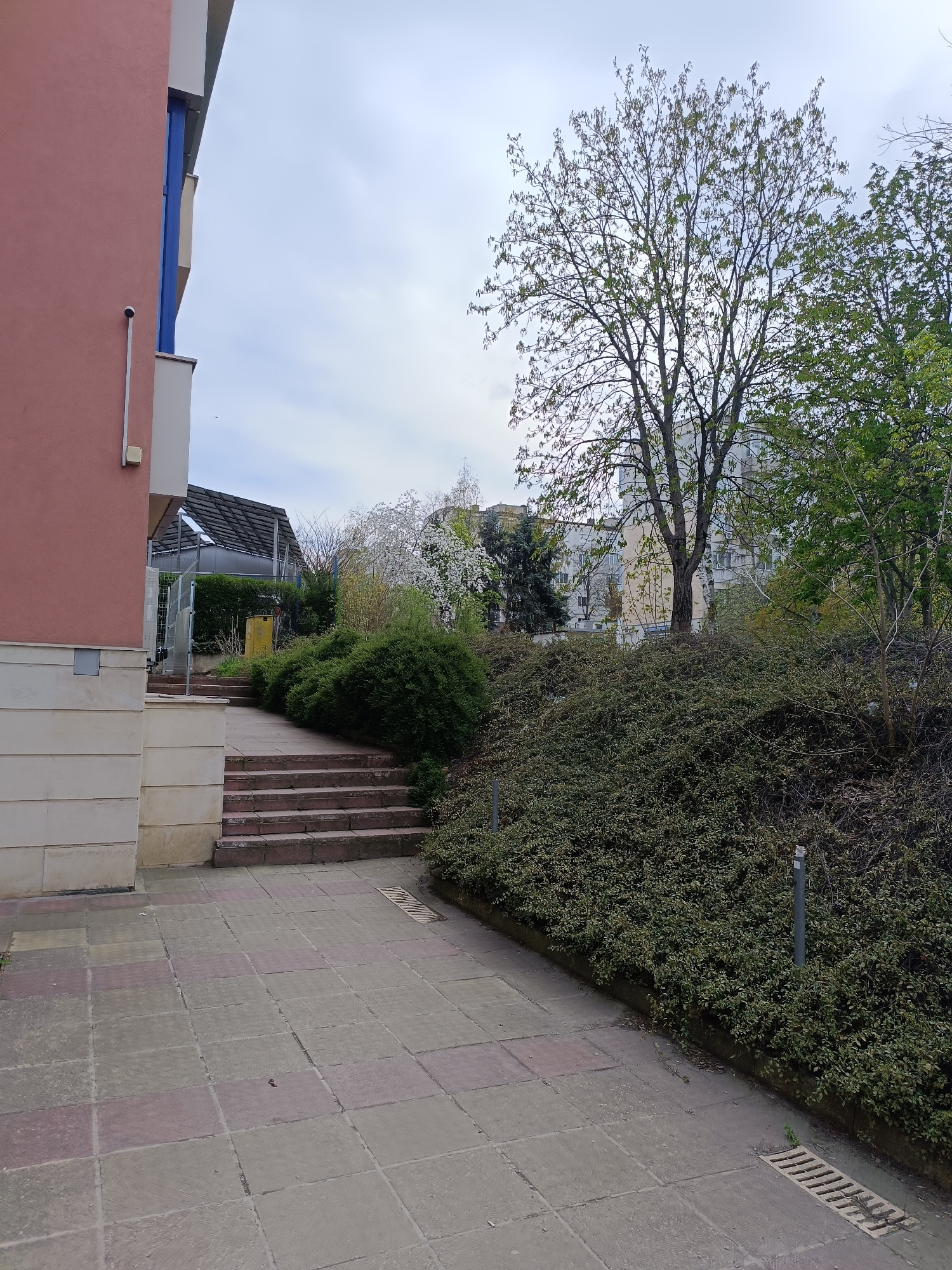 The image shows a pathway leading uphill in an urban setting, possibly a park or a residential area. The pathway is paved with rectangular stones of varying colors, and it has two sets of short stairs…read more