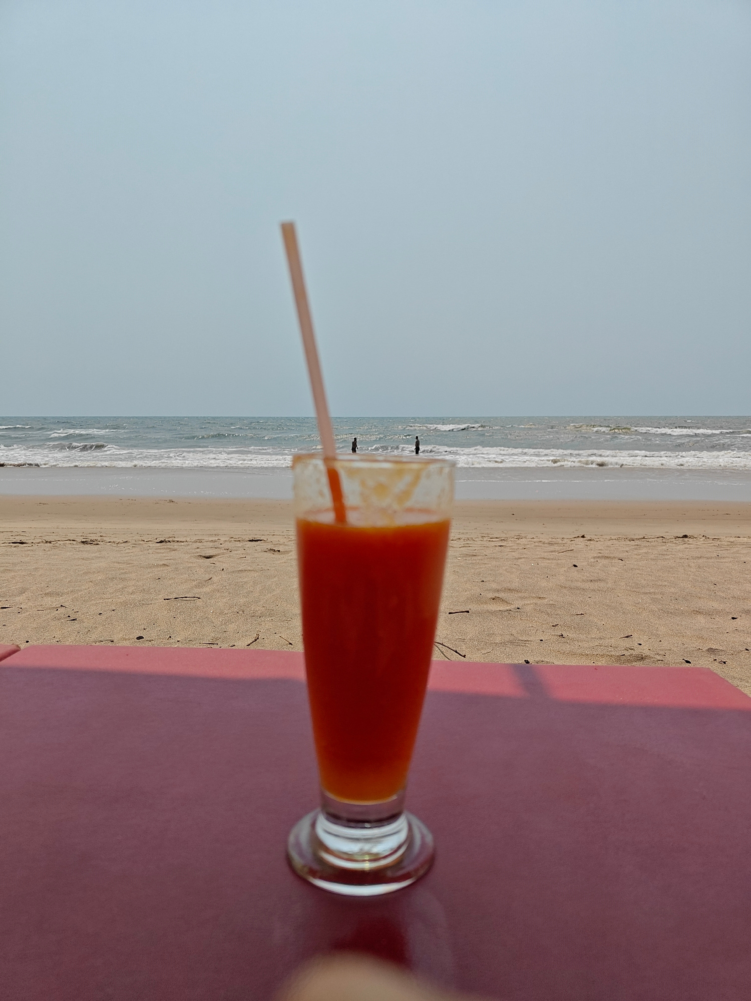 A glass of orange juice with a straw sits on a red table at Arambol beach, India. The beach stretches towards the horizon under a pale blue sky. Two people stand in the ocean, their figures small agai…read more