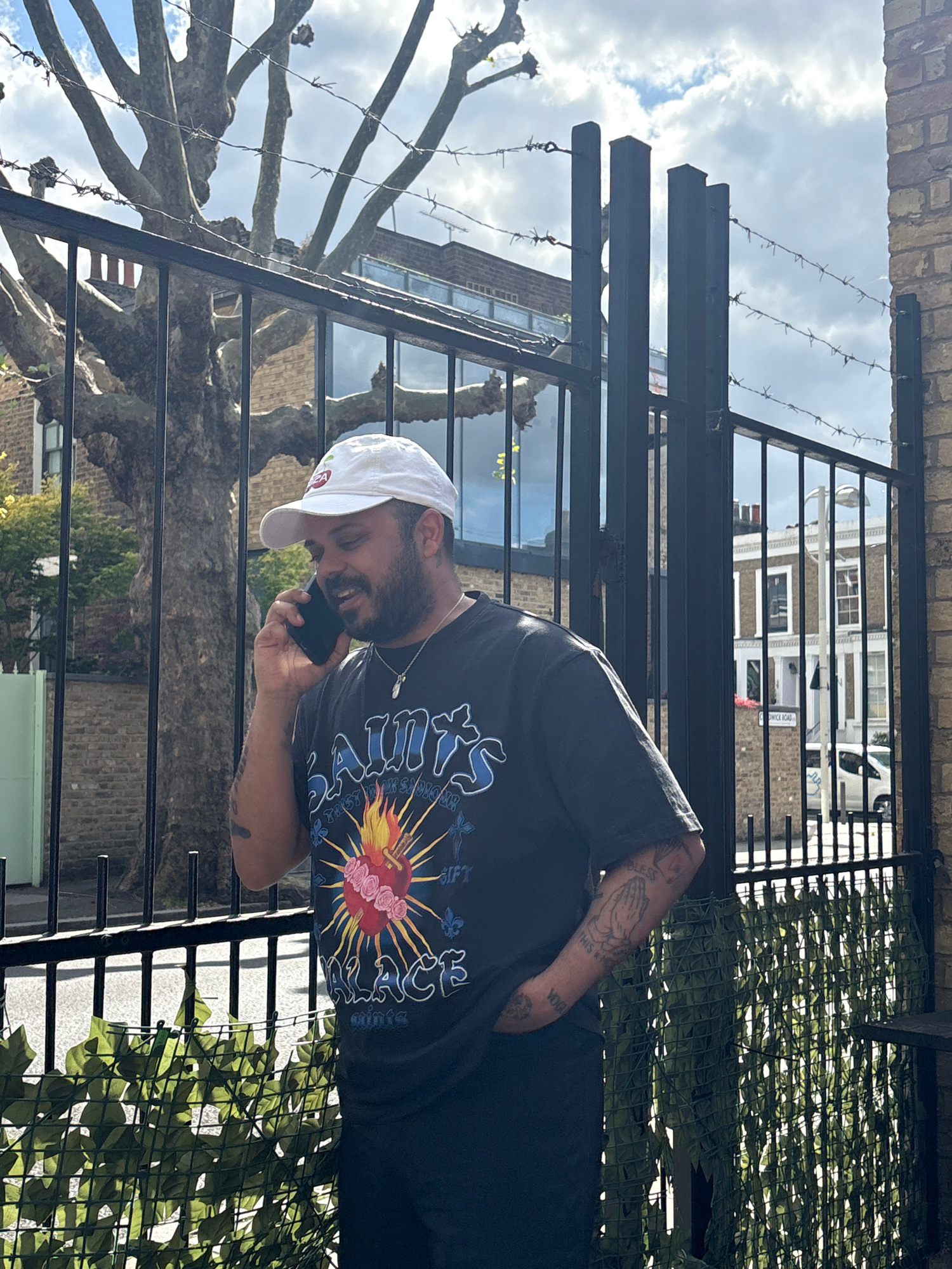 A bearded man, wearing a white baseball cap and a dark t-shirt with a colorful flaming sacred heart graphic, is depicted talking on a black smartphone. He is smiling, suggesting a pleasant conversatio…read more