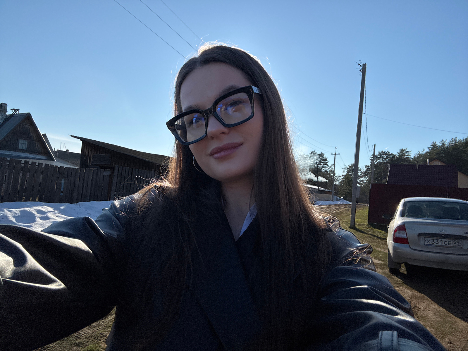 A woman is outdoors, possibly in the vicinity of Rusalevka, Russia. She is wearing eyeglasses and a jacket. The background includes a car with the license plate "X 331CE 52," buildings, a utility pole…read more