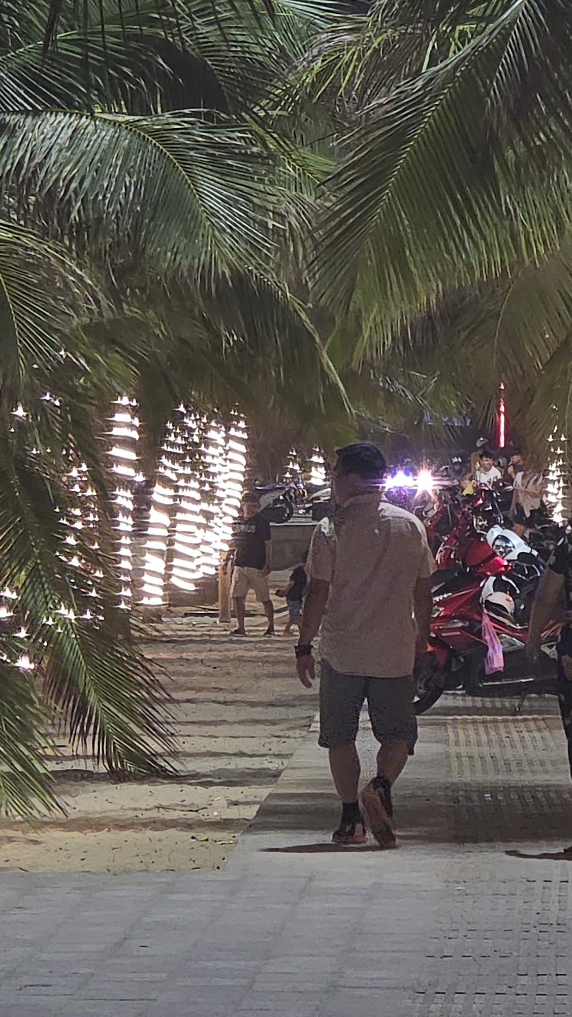 A nighttime image depicts a scene along a street in Nha Trang, Vietnam. A man in a light-colored shirt and shorts walks on a pavement along a busy street with motorbikes. Palm trees line the walkway.…read more