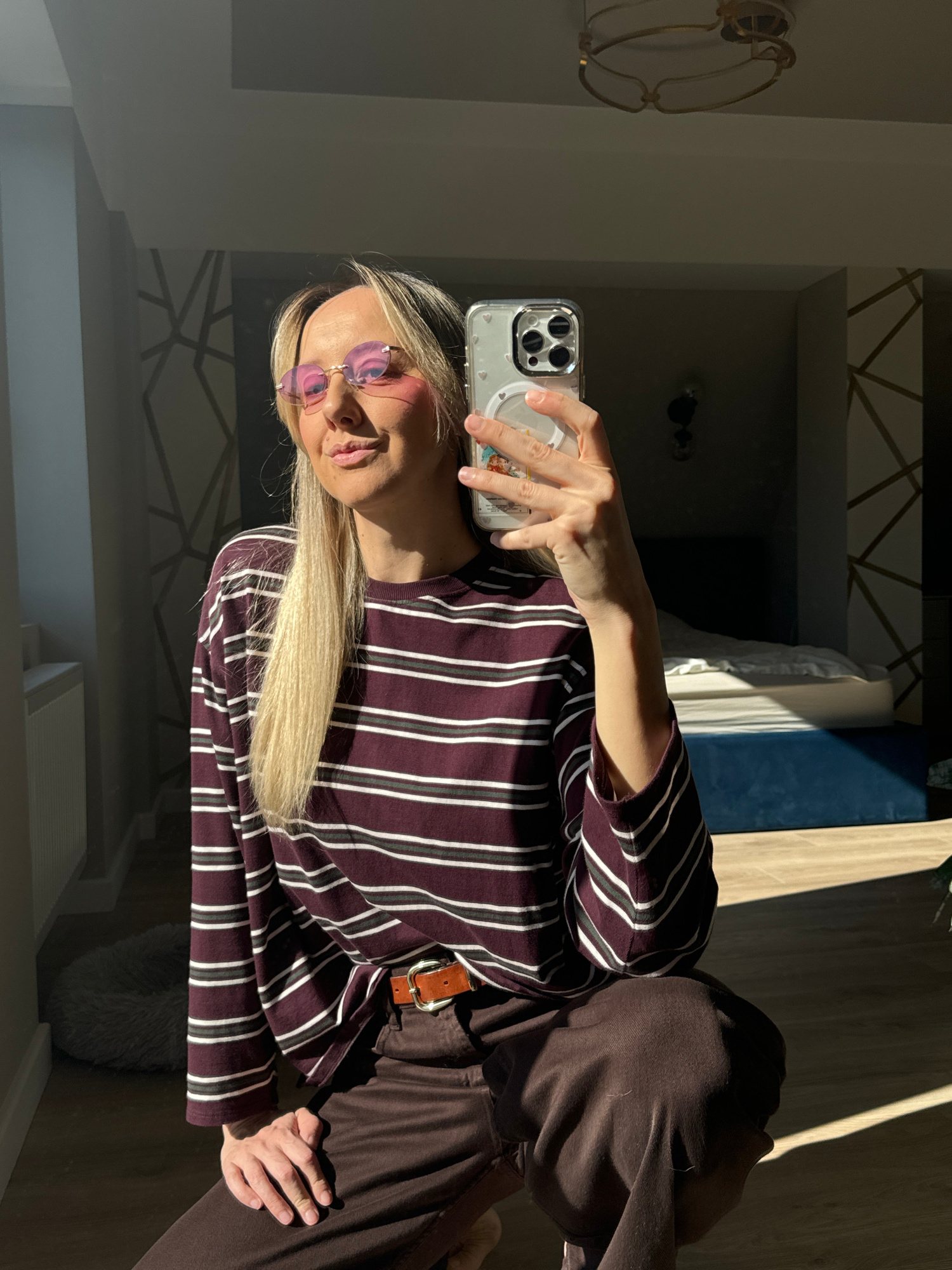 A woman with blonde hair and pink glasses is taking a selfie in a room with a mirror. She is wearing a striped shirt and brown pants with a brown belt. The background includes a bed and a wall with a…read more