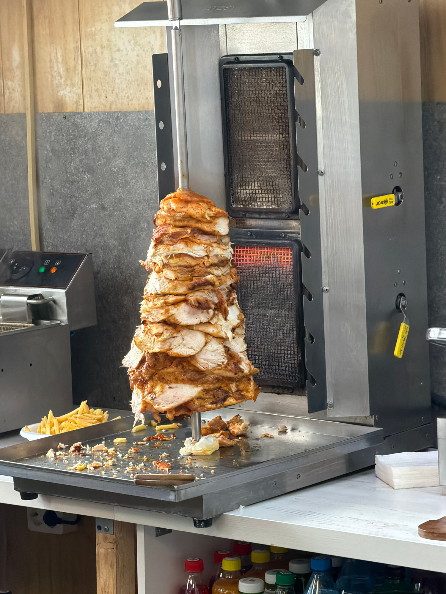 The image shows a vertical rotisserie kebab machine with a partially carved cone of meat, likely chicken or a mix of meats, positioned in front of a gas-powered infrared broiler. The broiler has a saf…read more