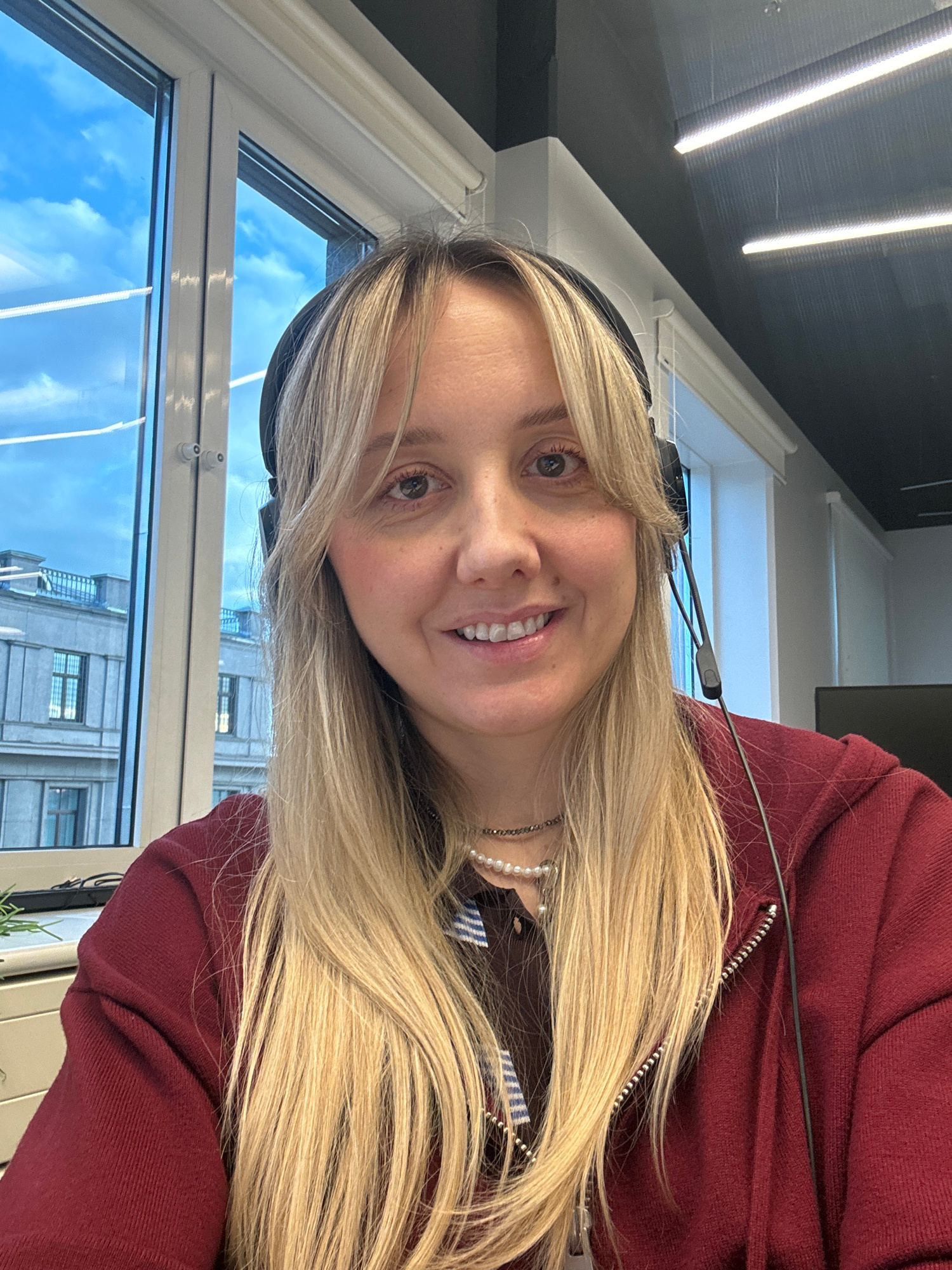 An adult female is depicted in a close-up, smiling directly into the camera. She has long, straight blonde hair with bangs and is wearing a dark red zippered hooded garment over a brown and white stri…read more