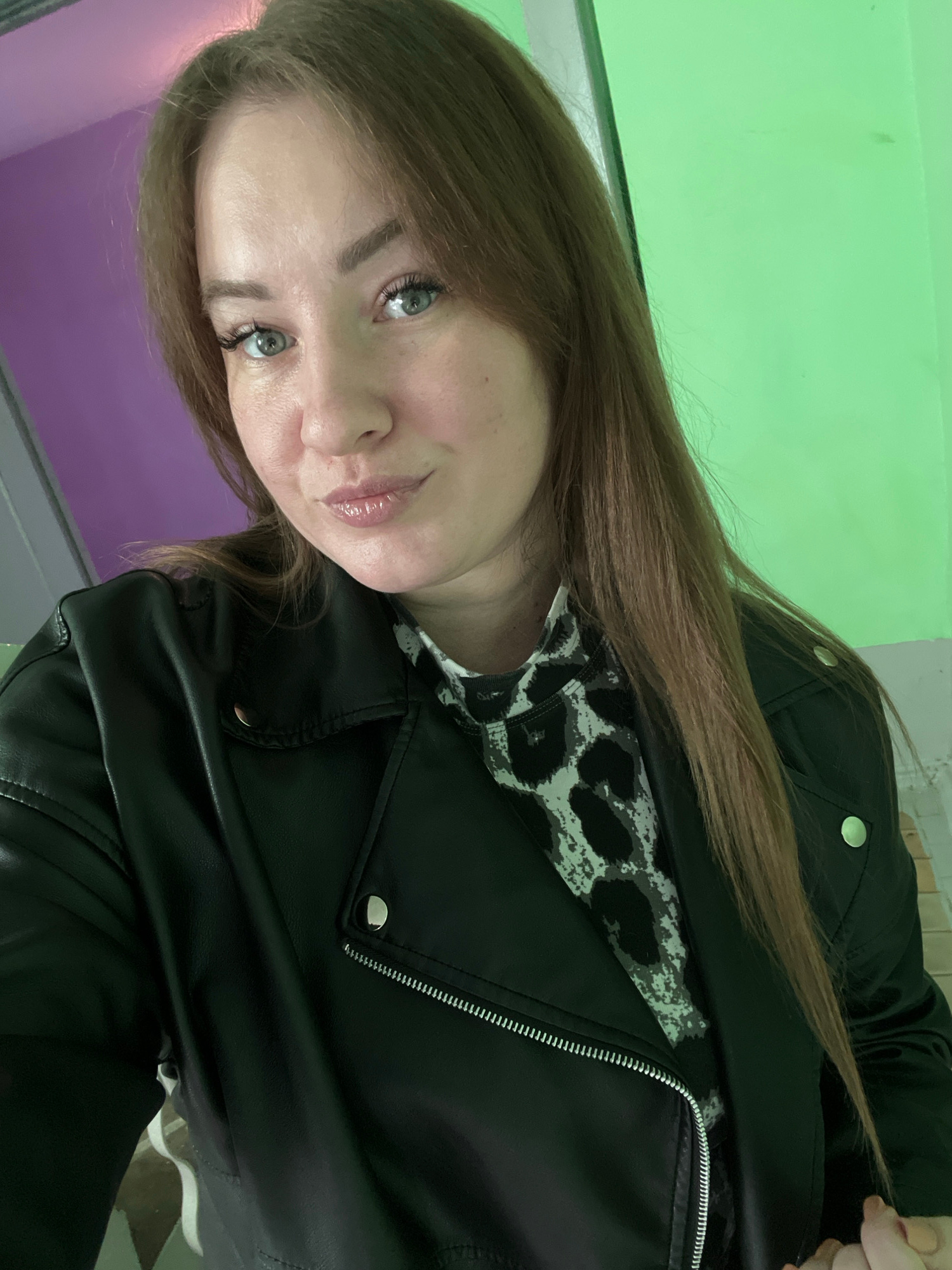 A woman with long brown hair, wearing a black leather jacket over a gray and white patterned shirt, is posing for a selfie. The background consists of a green and purple wall. The location is Chaikovs…read more
