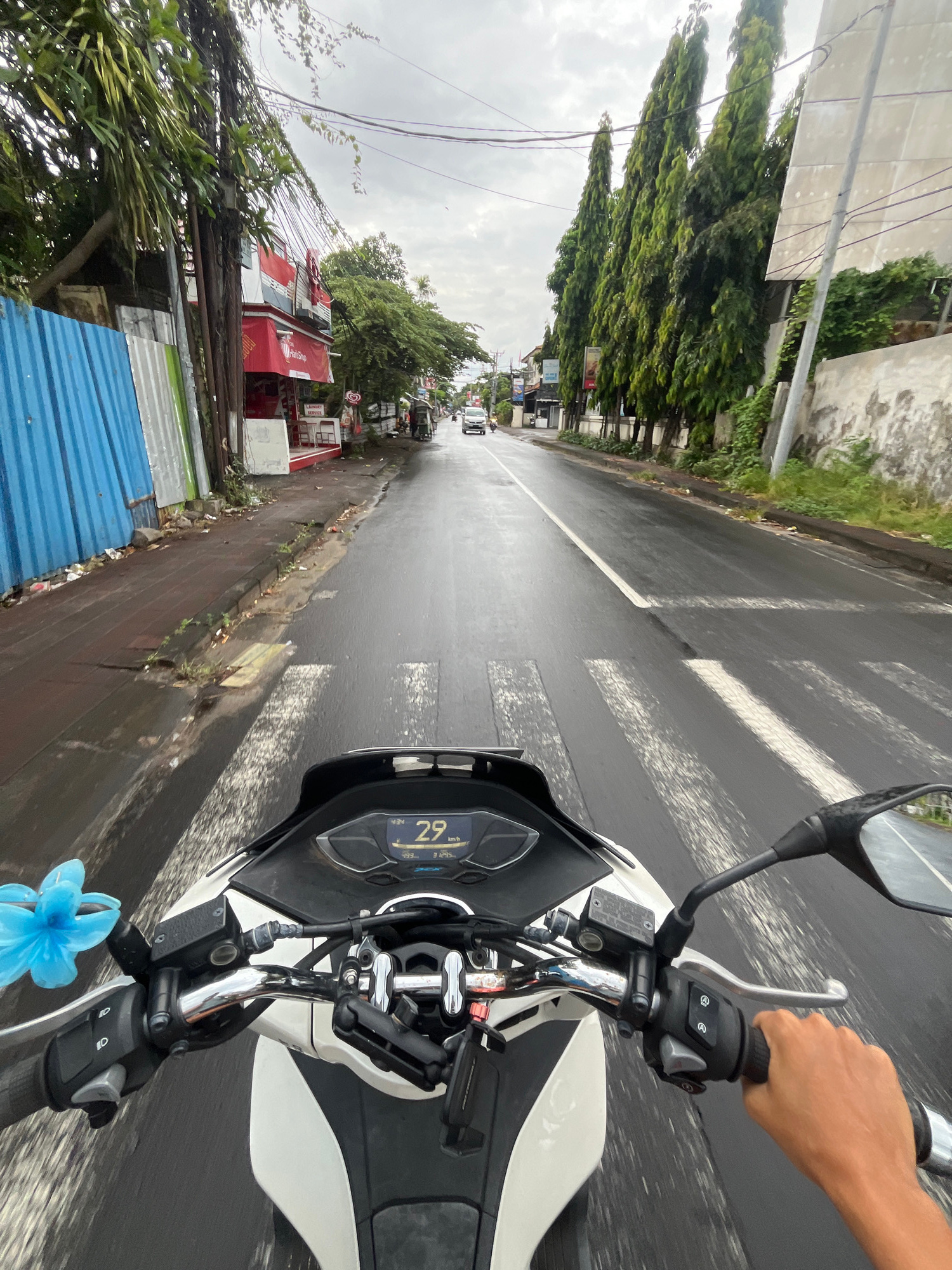 The image presents a first-person perspective from someone riding a white and black scooter on a wet asphalt road in Kuta Selatan, Indonesia. The rider's right hand firmly grips the throttle on the ha…read more