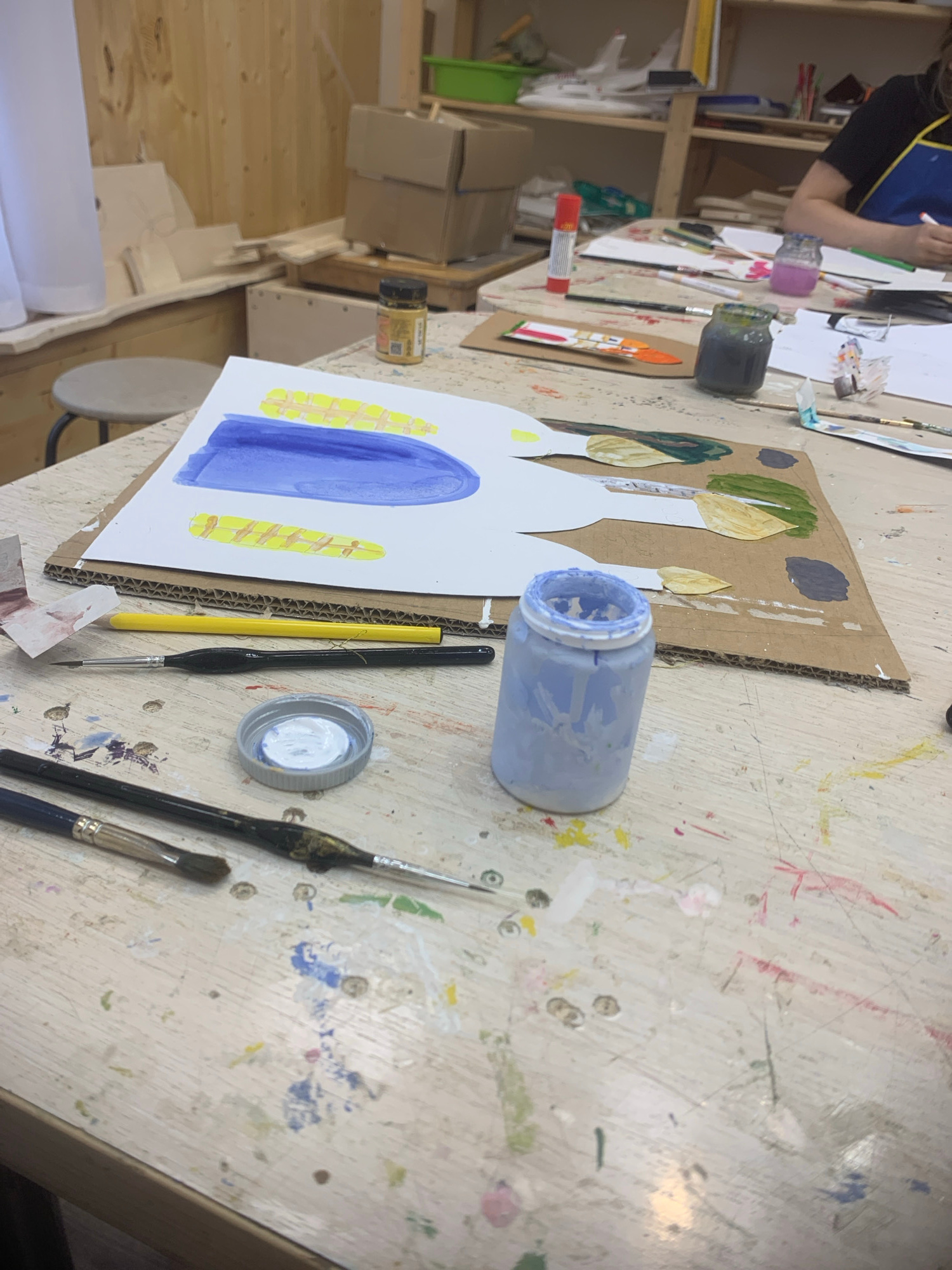 The image depicts a slightly cluttered art table, possibly in a studio setting. A painting on cardboard is central, featuring three white shapes with blue and yellow detailing, perhaps stylized buildi…read more