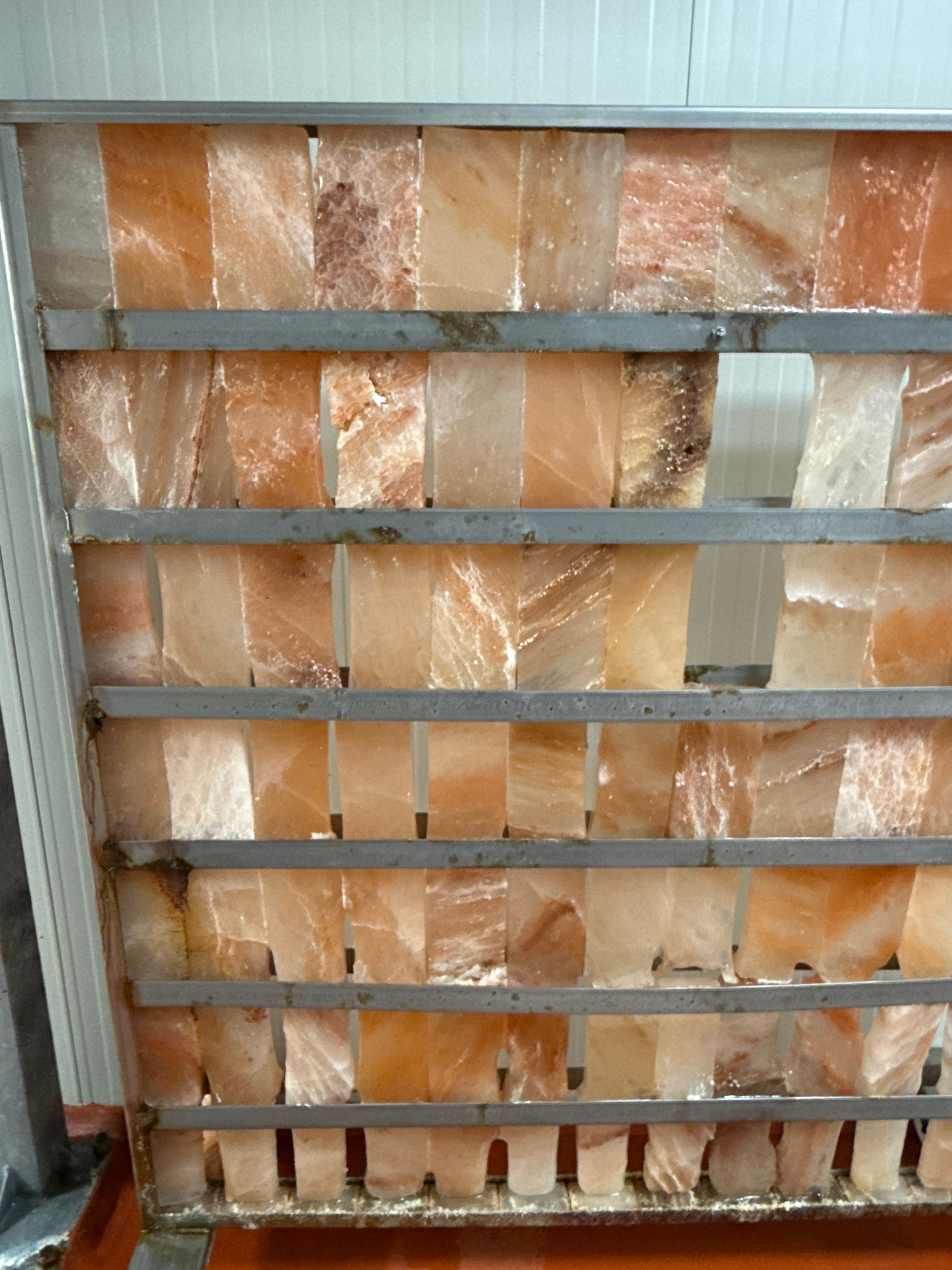 The image displays a close-up of an architectural or decorative partition constructed from numerous translucent blocks. These blocks vary in color from pale pink and off-white to warmer orange and red…read more