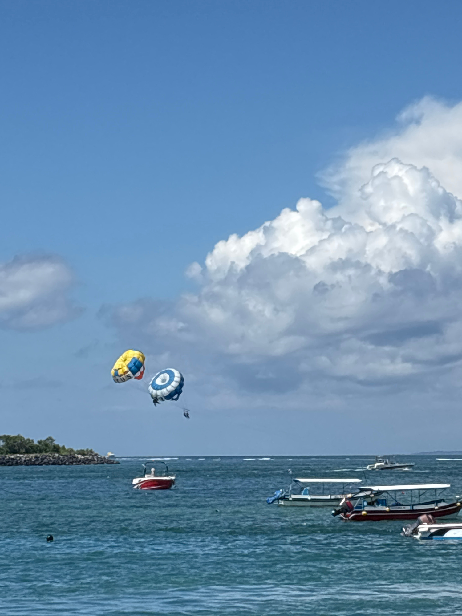 The image depicts a coastal scene in Tanjung Benoa, Indonesia. The sky is predominantly blue with large, puffy white clouds. Two parasailers are suspended in the air; one has a yellow and red parachut…read more