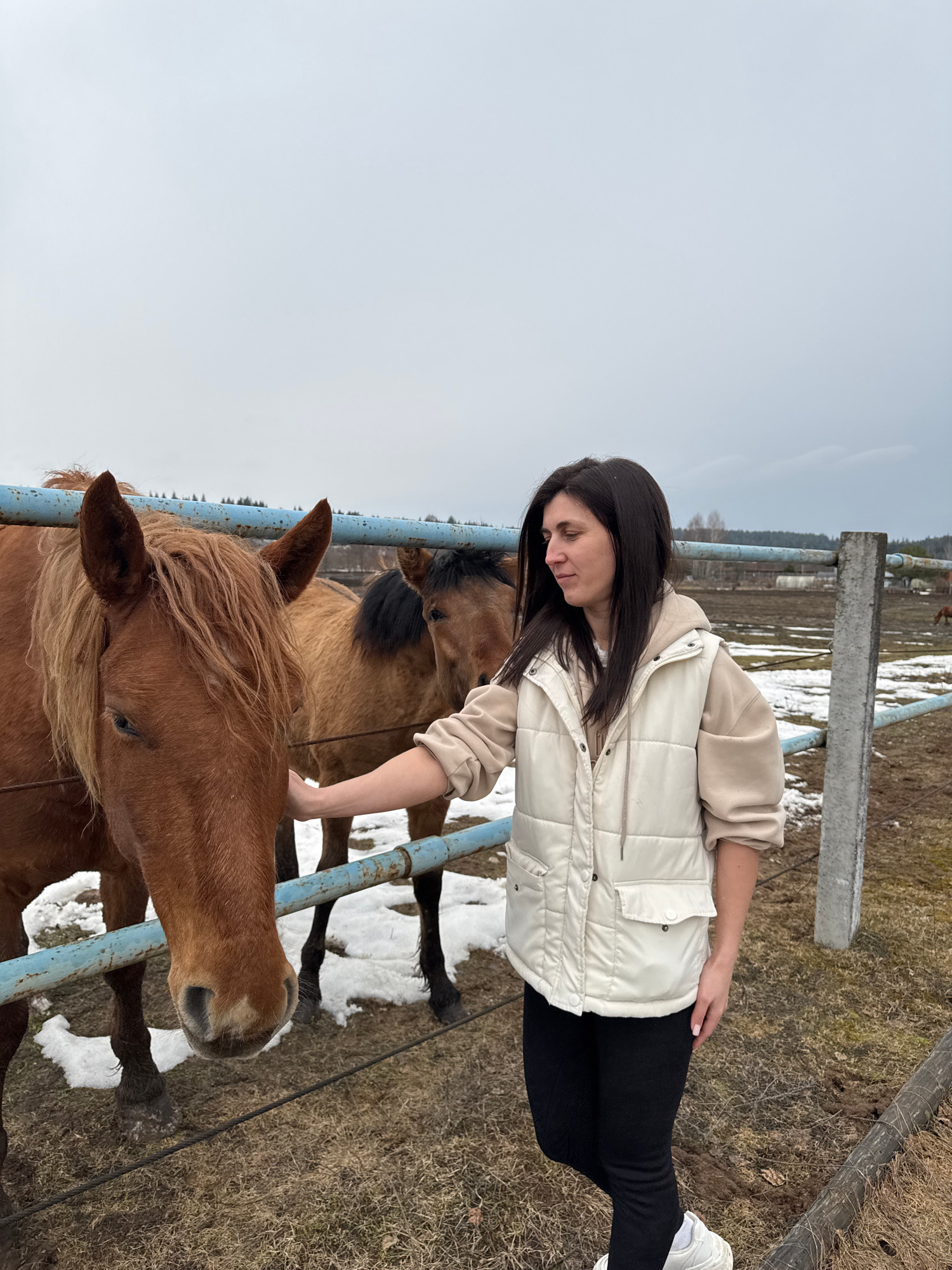 In Opary, Russia, an unidentified woman with long, dark hair is interacting with a brown horse in an outdoor pen. The woman is wearing a beige hoodie and a white puffer vest over black leggings and wh…read more