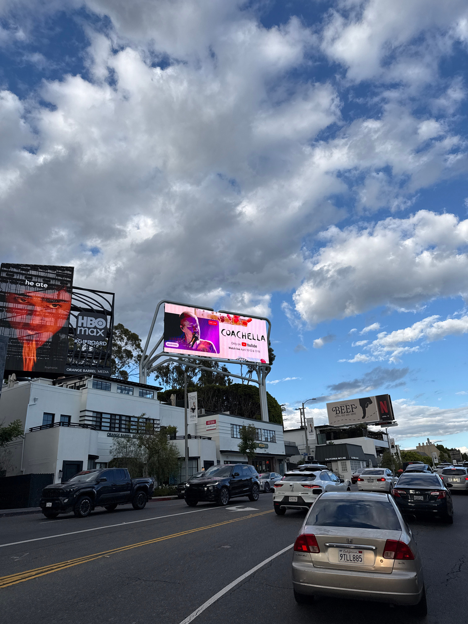 The image captures a street scene in Los Angeles, filled with a mix of billboards and traffic. Dominating the view are several large billboards displaying advertisements for HBO Max's "Euphoria", Coac…read more