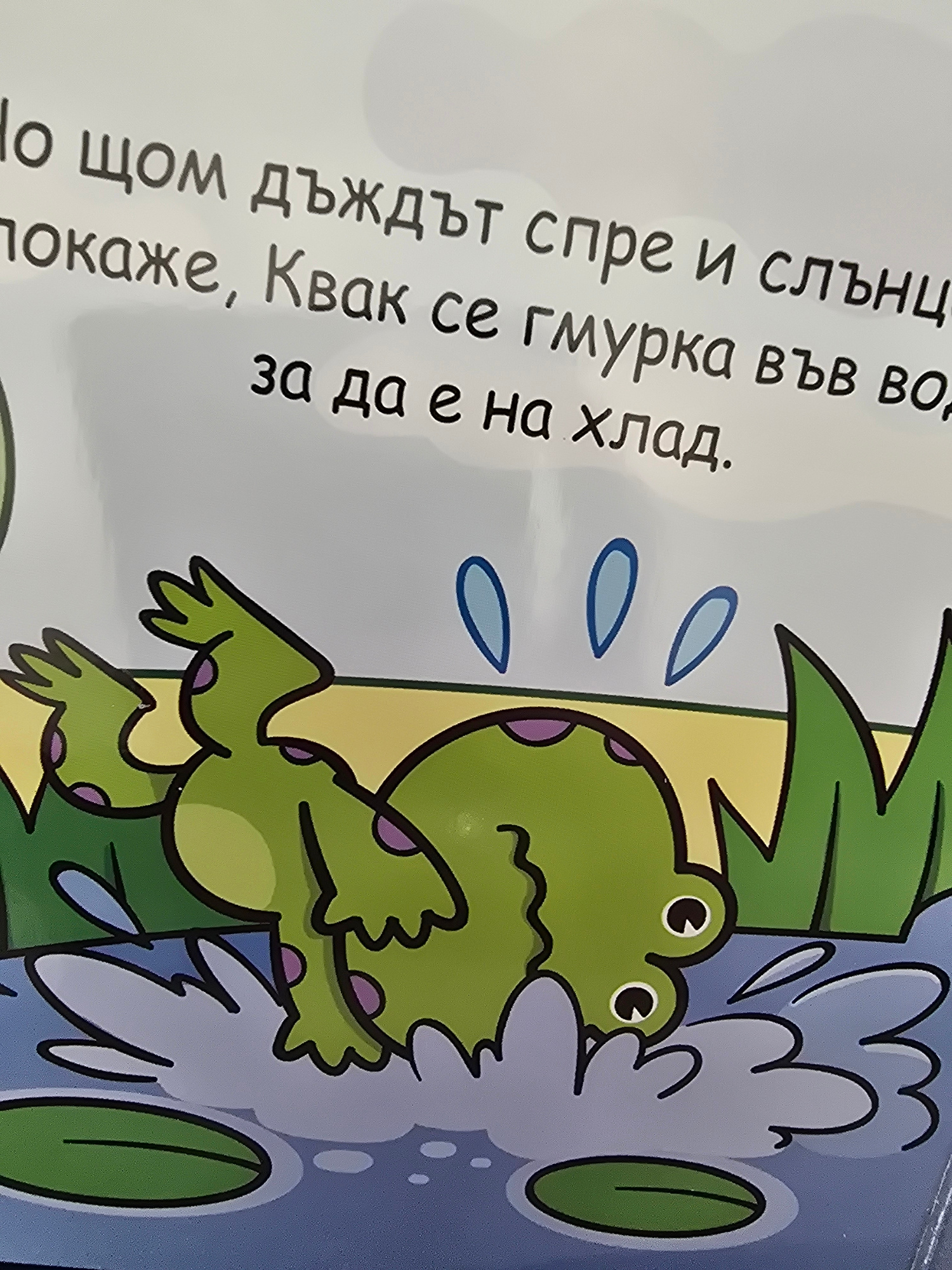 The image displays a vibrant, cartoon-style illustration of a green frog with purple spots. The frog is actively engaging with a body of water, depicted with large white splashes and partially visible…read more