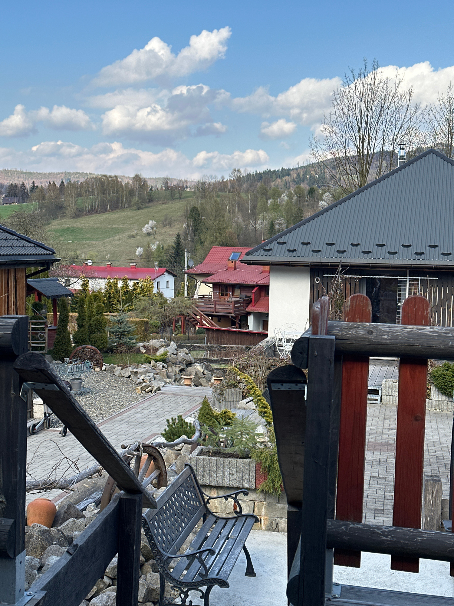 This image captures a serene, panoramic view of a rural or mountainous landscape, likely Wisła, Poland, from what appears to be a balcony or elevated deck. The perspective looks over a landscaped gard…read more