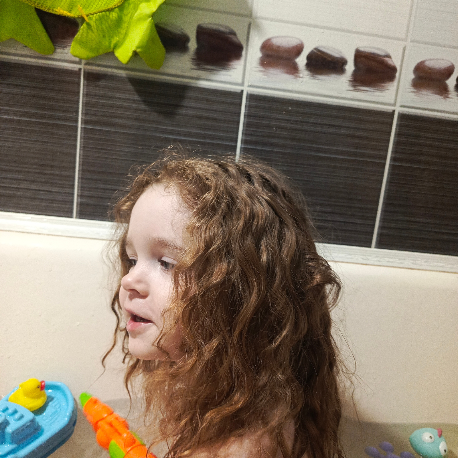 A young child with wet, curly, reddish-brown hair is in a bathtub. The child is positioned in the foreground, facing left. Partially visible in the lower left corner is a blue toy boat with a yellow d…read more