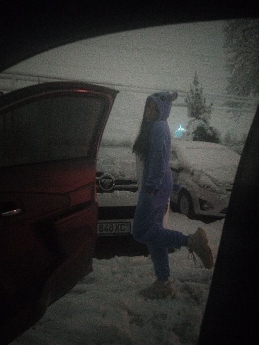 The image displays a snowy outdoor scene in Tashkent, Uzbekistan, observed from the interior of a red vehicle with its rear driver-side door open. A lone female subject, wearing a light purple hooded…read more