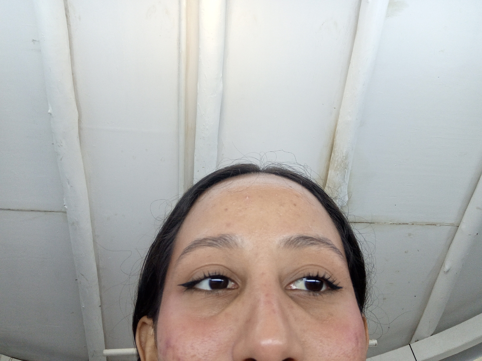 A close-up, upward-angle photograph shows the face of a person with dark hair. The person has brown eyes with visible eyeliner. The forehead shows some freckles or blemishes. The person's skin tone ap…read more