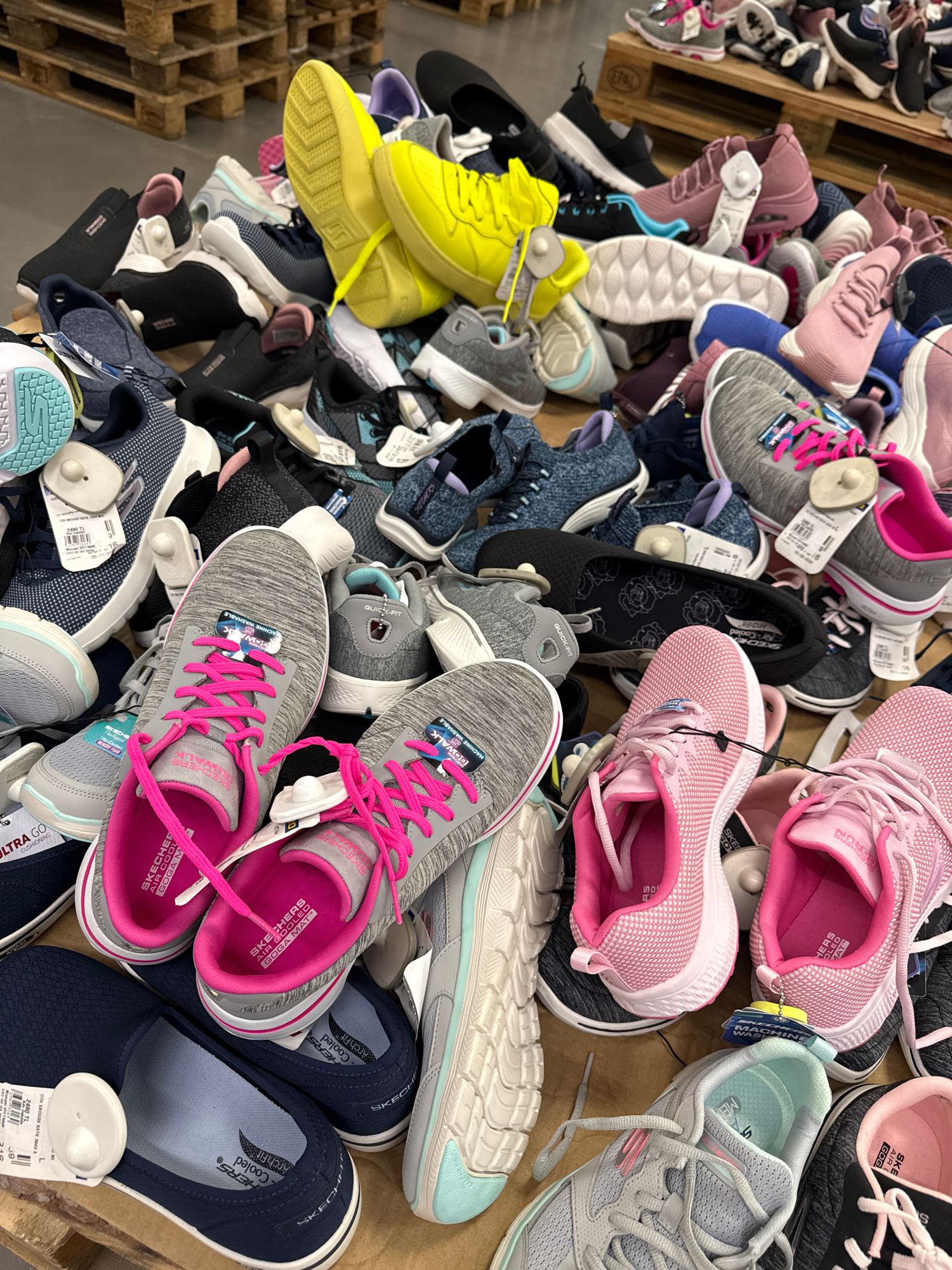 A disorganized pile of shoes sits on wooden pallets. The shoes are various colors and styles, including sneakers, slip-ons, and casual shoes. Many have tags and security devices attached. Brand names…read more