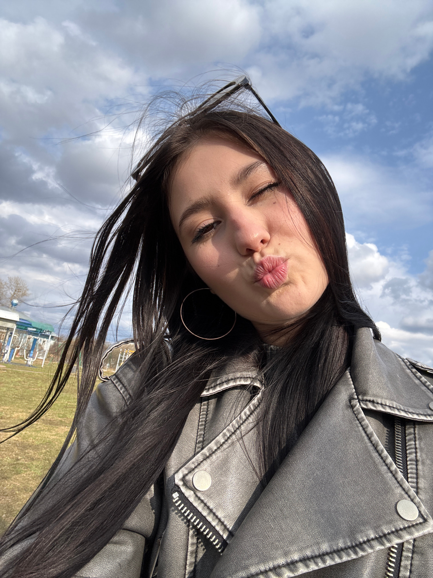 A young woman with long, dark hair is posing for a selfie outdoors. She is wearing a gray leather jacket and a large hoop earring. Her eyes are partially closed, and she is puckering her lips. The bac…read more