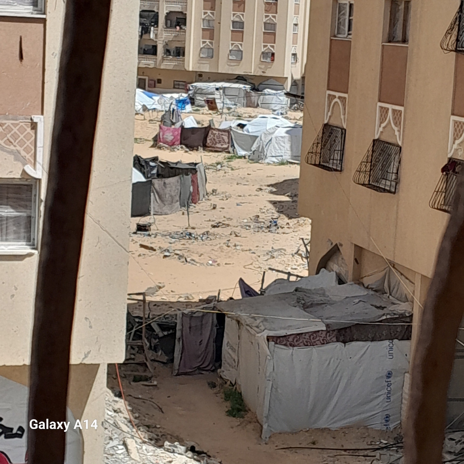 The image shows a view into a debris-filled space between two buildings. The buildings are multi-story structures, one with architectural details like window boxes. In the debris-filled area, there ar…read more