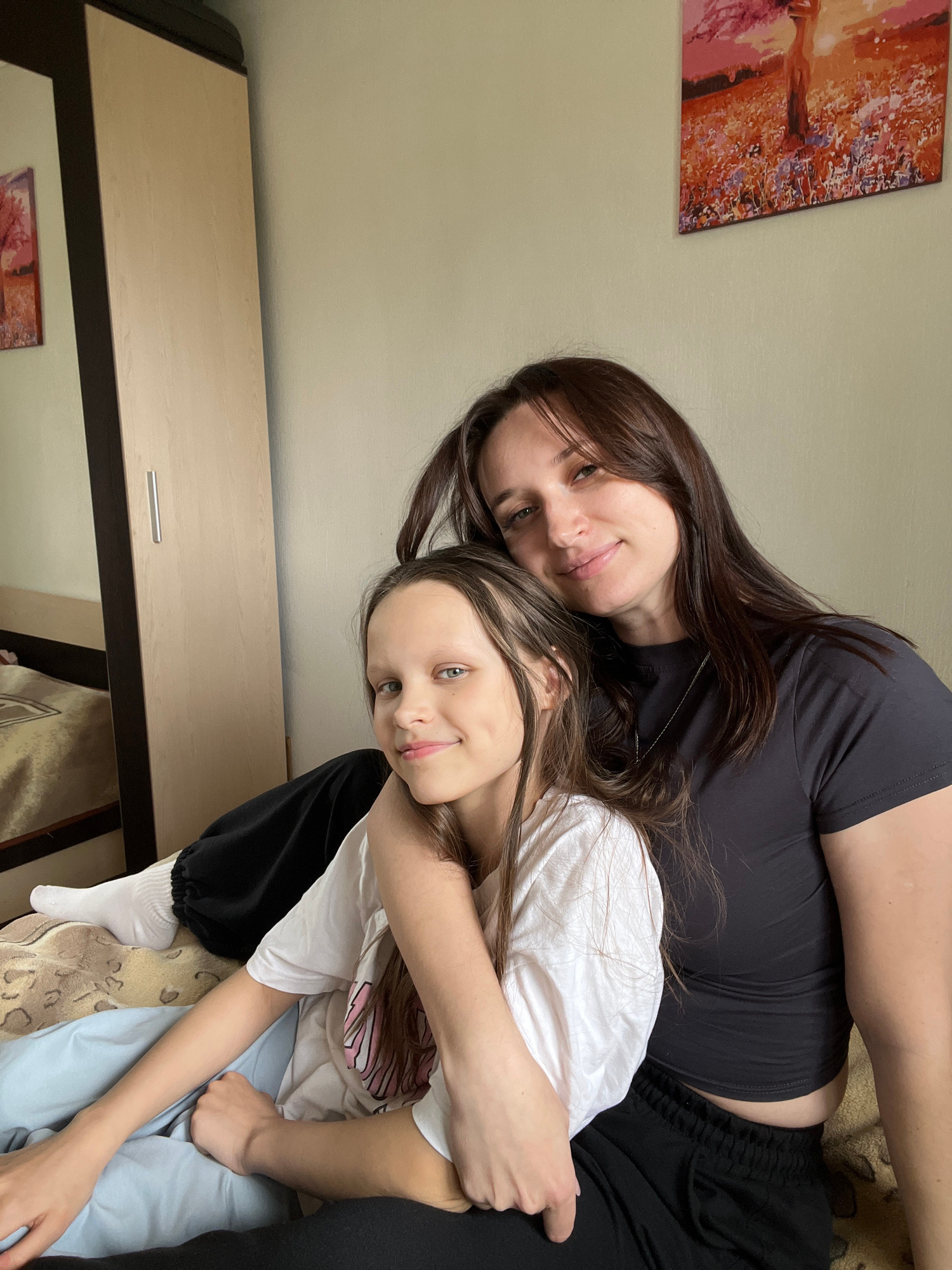 A woman and a girl are embracing indoors in Usol'tseva, Russia. The woman has dark brown hair, is wearing a black crop top and black sweatpants. The girl has light brown hair and is wearing a white t-…read more