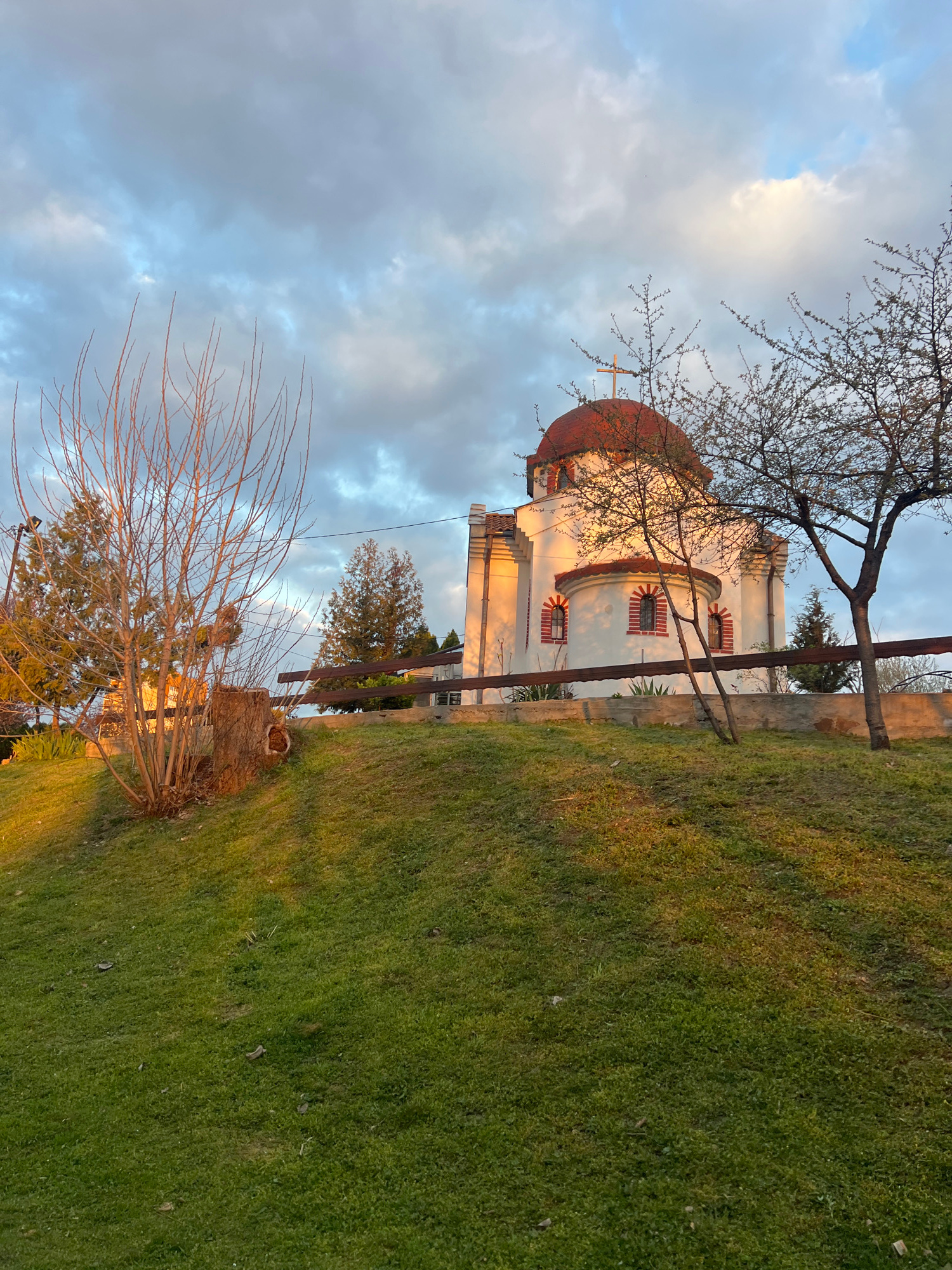 The image shows a building with a red dome, possibly a church or religious structure, viewed from an upward angle. The building is white with red trim and is bathed in warm, golden light, suggesting e…read more