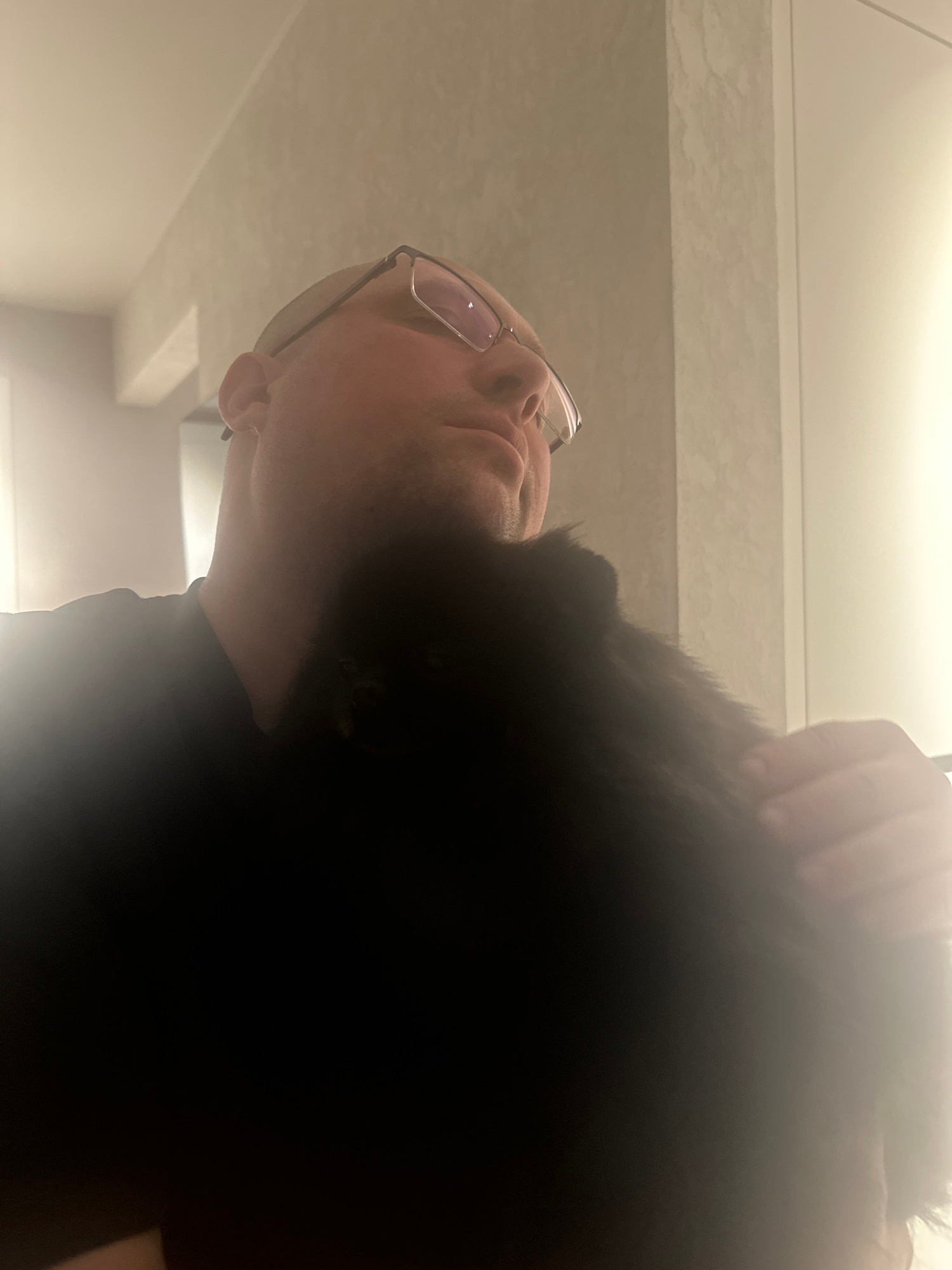 A low-angle shot shows a man with glasses looking up. A large, dark, furry mass obscures much of the frame on the right side, with a visible hand resting on top of it, suggesting it could be a large p…read more