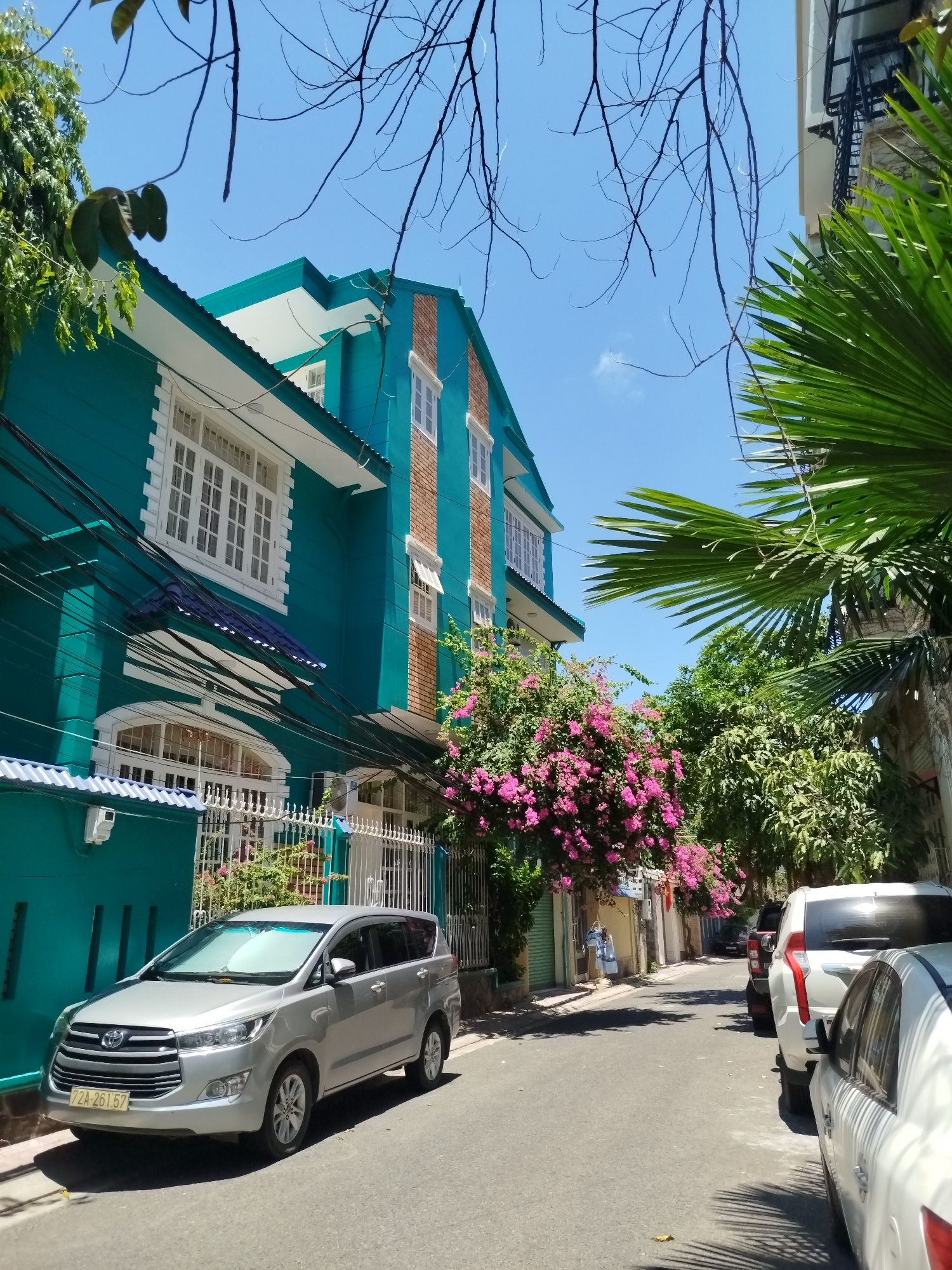 The image depicts a street scene in Ho Chi Minh City, Vietnam, characterized by a teal-colored building on the left with white trim and brick accents on an upper section. The building has a prominent…read more