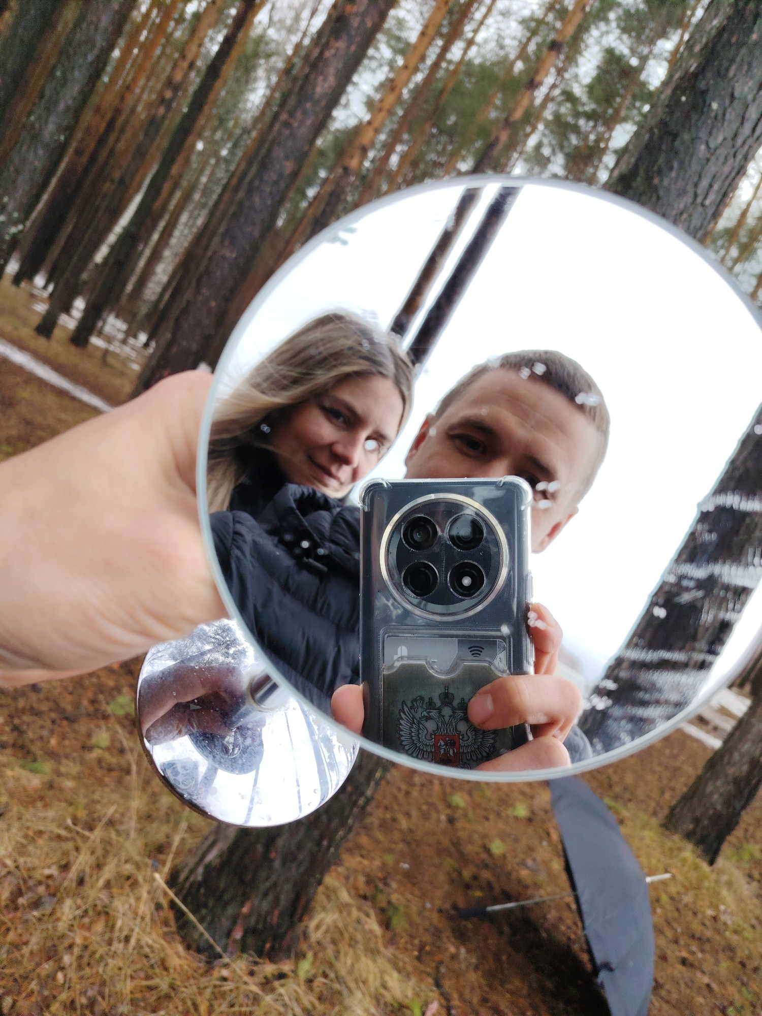 A mirrored self-portrait of a woman and a man holding a smartphone with a clear case that has an image of the Russian coat of arms is taken outdoors. They are in a wooded area near the city of Chaikov…read more